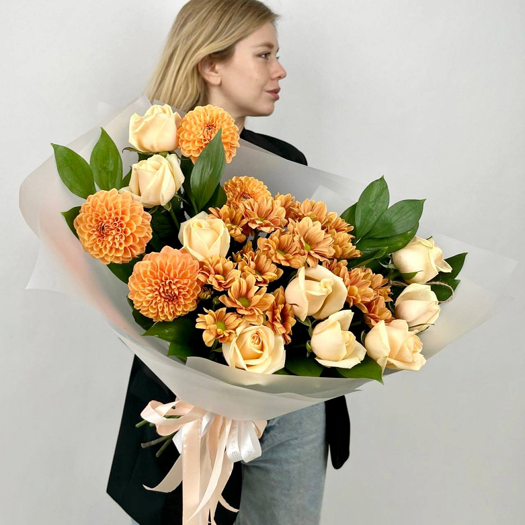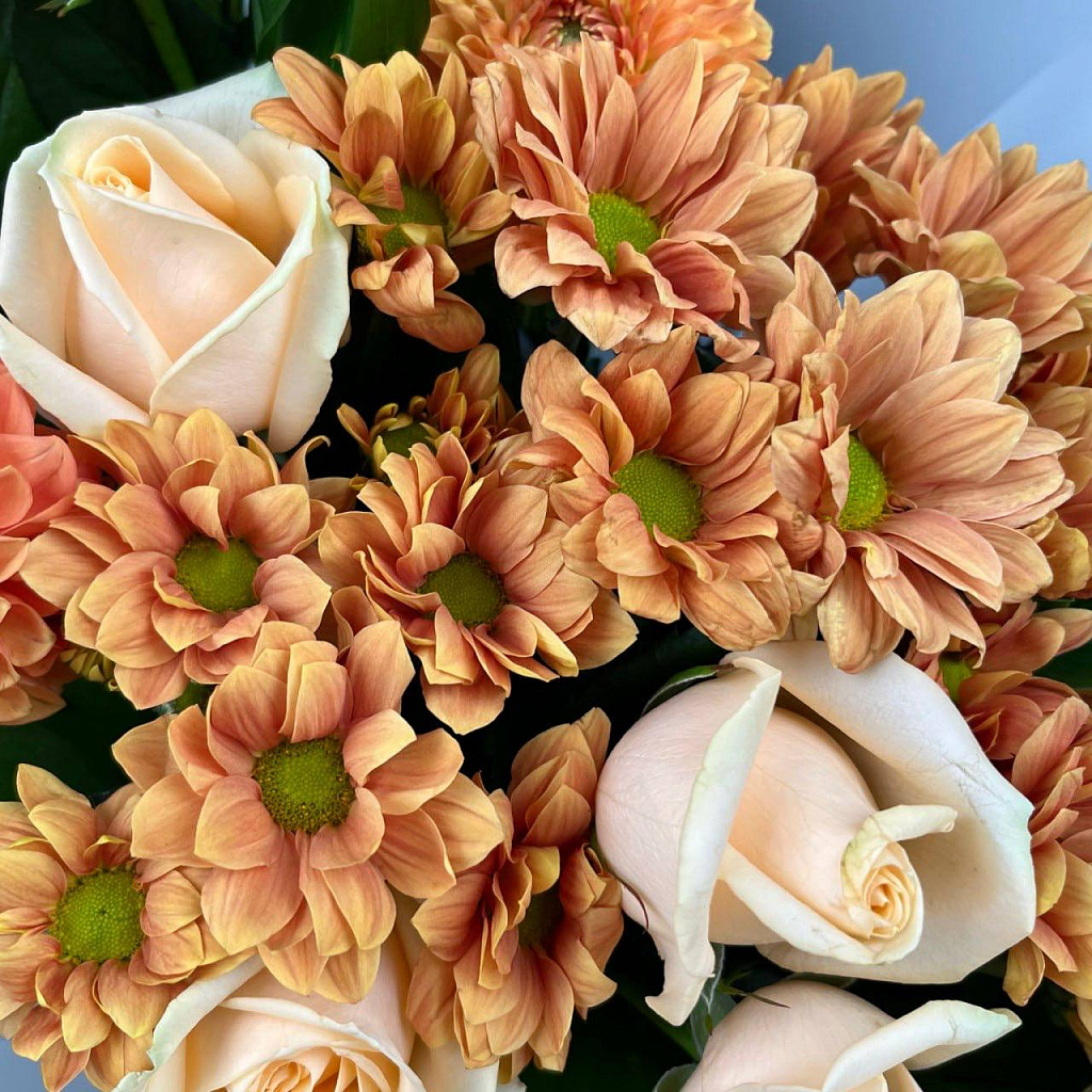 Роза Аваланж пич (50см) РОССИЯ - 9 шт., Хризантема кустовая розовая - 3 шт., Русскус отеч. - 7 шт., Сезонная зелень - 4 шт., Современная упаковка - 1 шт., Лента атласная - 1 шт.