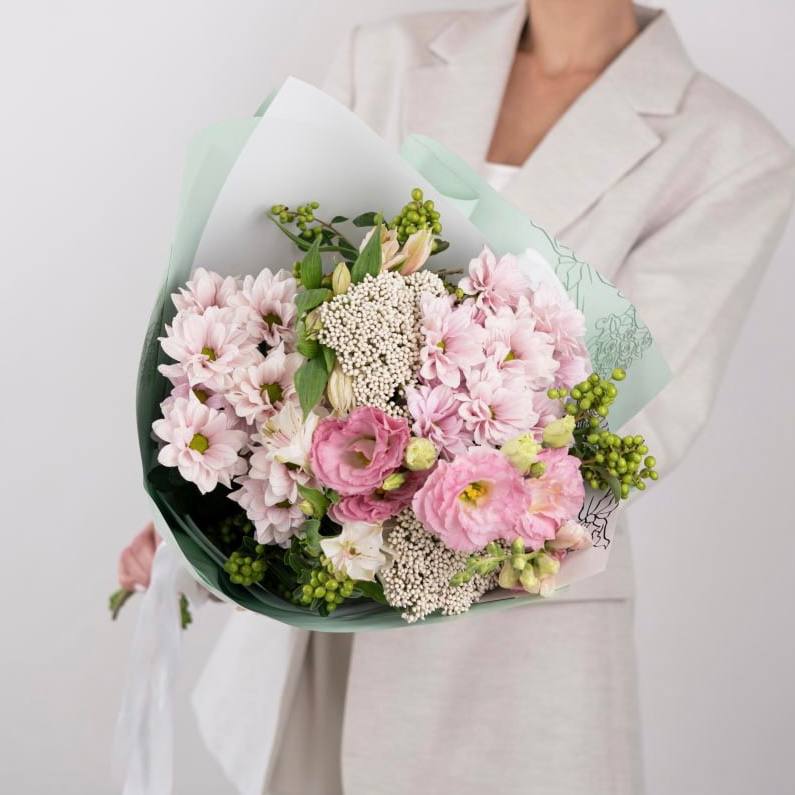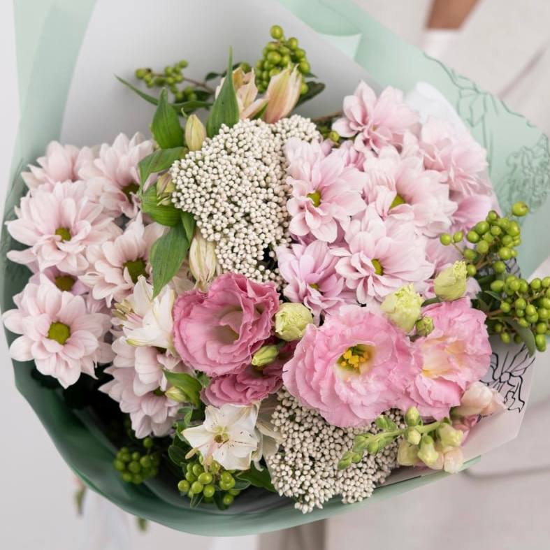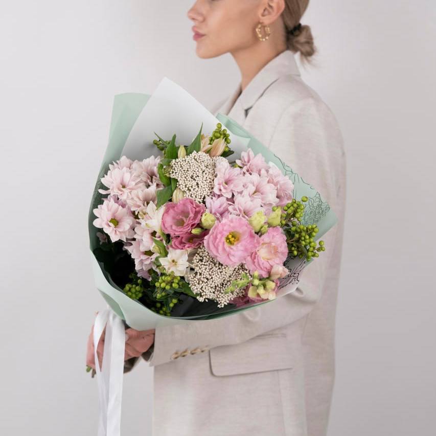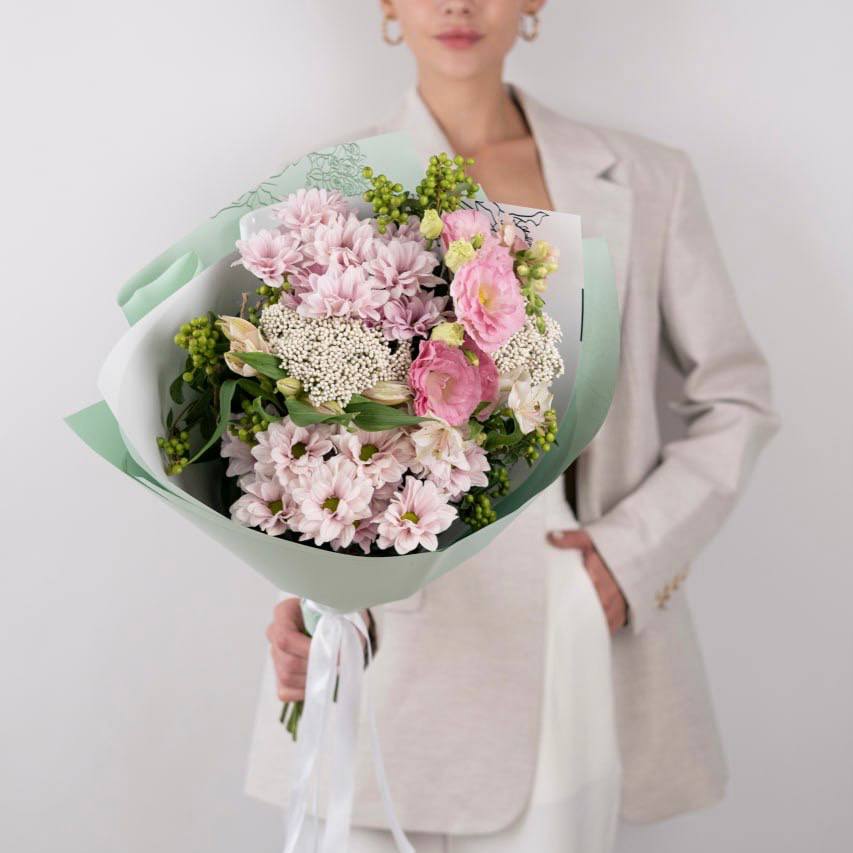 Хризантема кустовая розовая - 3 шт., Альстромерия - 3 шт., Озотамнус - 2 шт., Сезонная зелень - 2 шт., Современная упаковка - 1 шт., Лента атласная - 1 шт., Эустома - 2 шт.