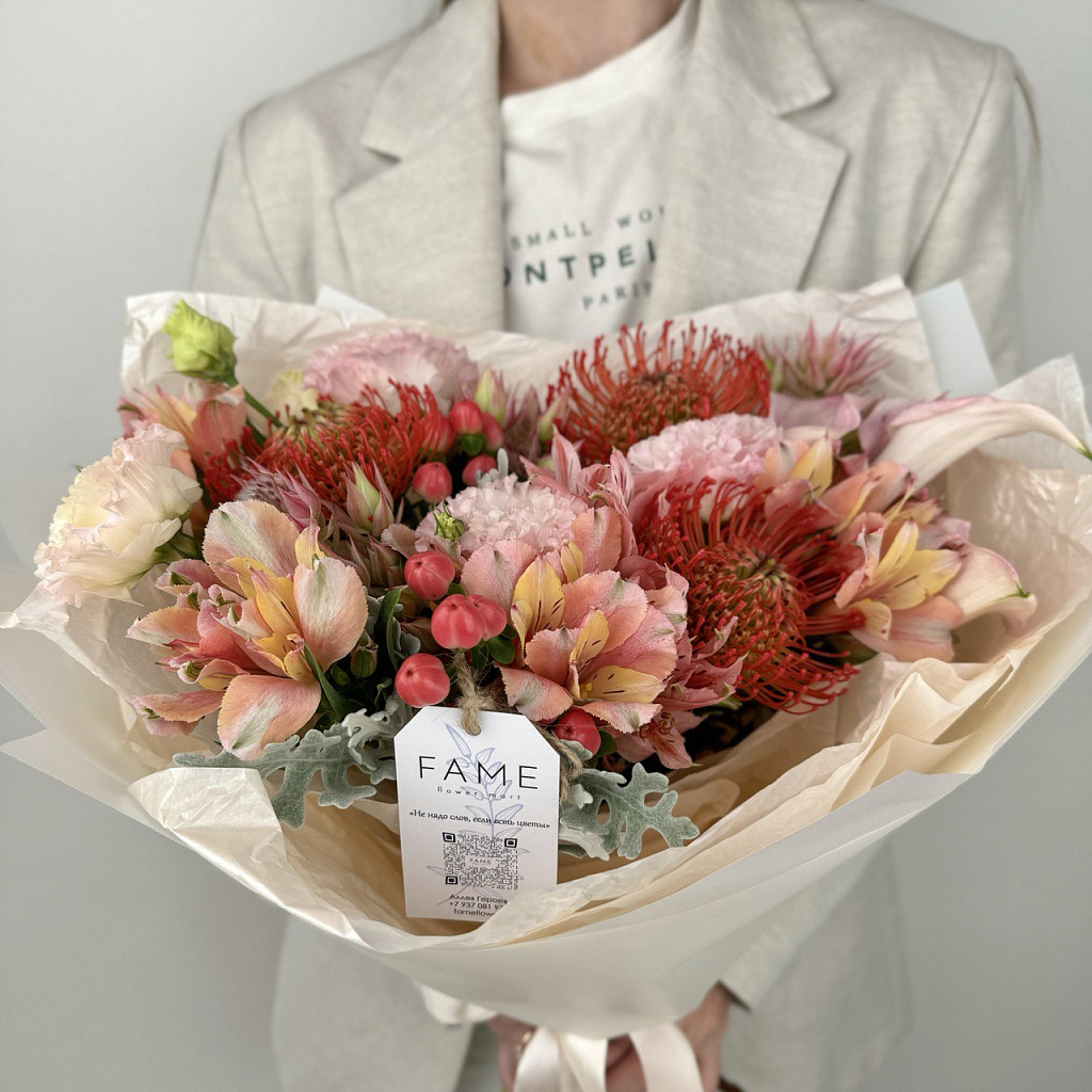 Букет, в который вложено много любви. Флористы студии FAME сделали его из самых свежих цветов, тщательно продумав состав. Теперь он готов удивить красотой своего получателя!