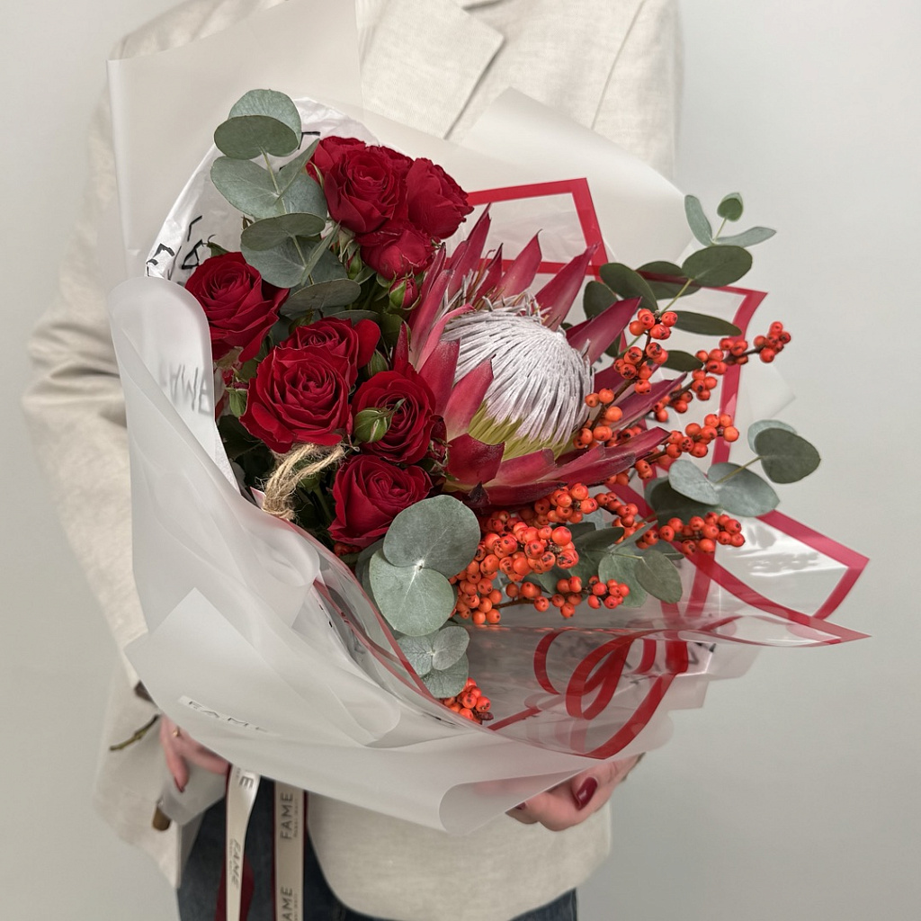 Протея - 1 шт., Илекс - 1 шт., Роза кустовая пионовидная - 2 шт., Эвкалипт большой - 4 шт., Современная упаковка - 1 шт., Лента атласная - 1 шт.
