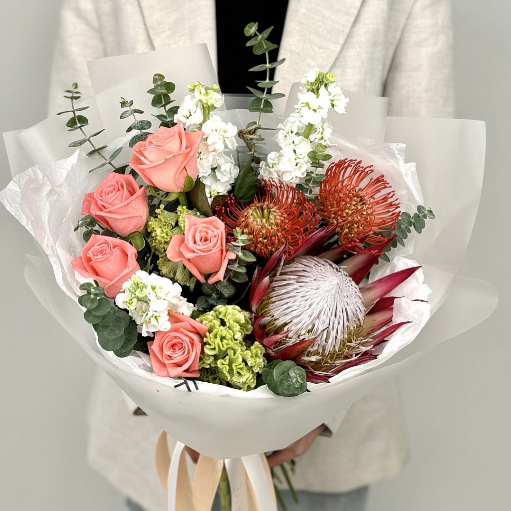 Протея - 1 шт., Леукоспермум - 2 шт., Целозия - 2 шт., Маттиола - 3 шт., Роза Карина (50см) РОССИЯ - 5 шт., Эвкалипт большой - 3 шт., Современная упаковка - 1 шт., Лента атласная - 1 шт.