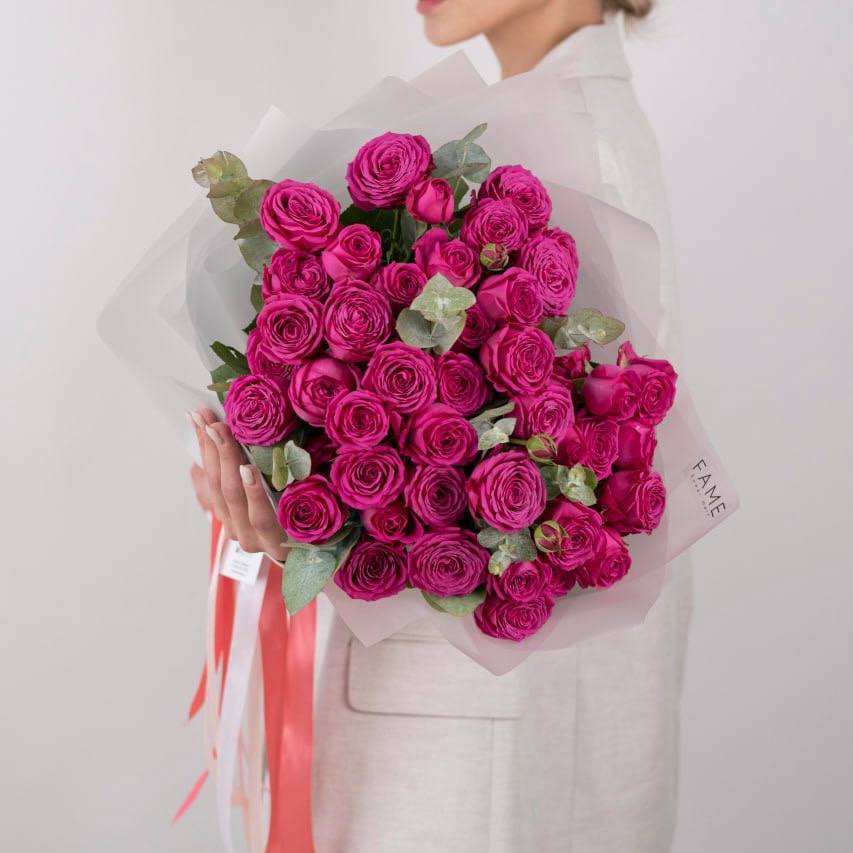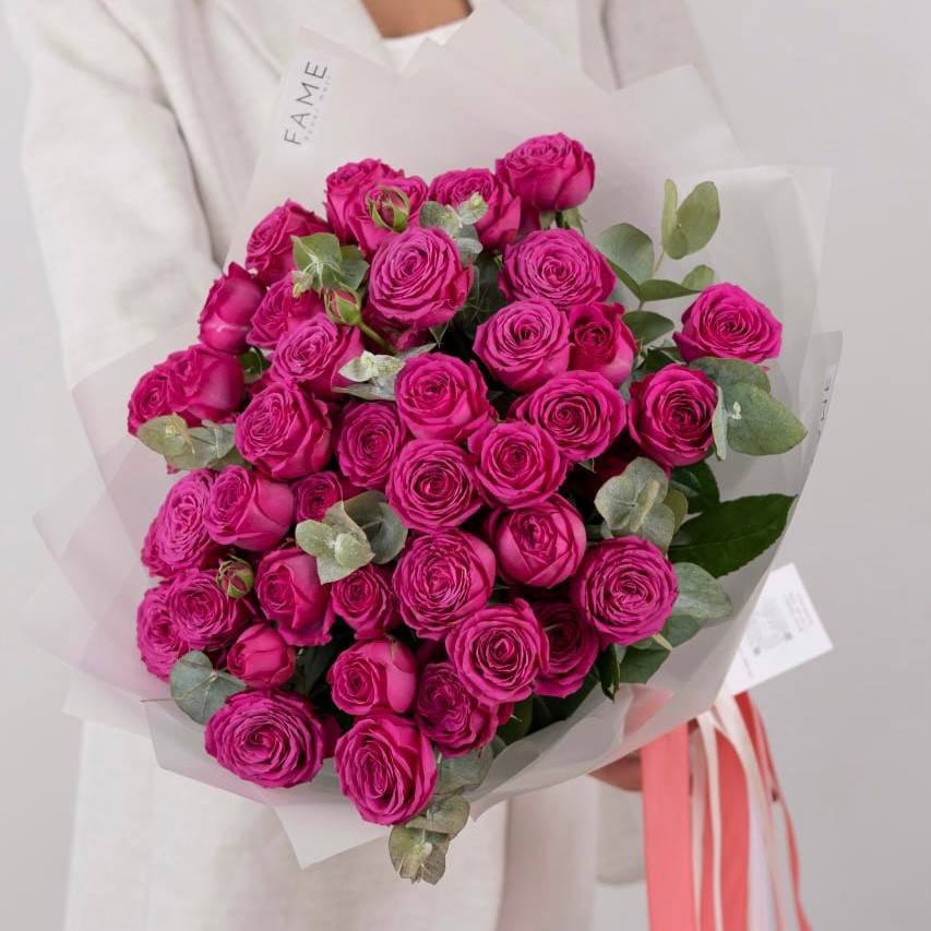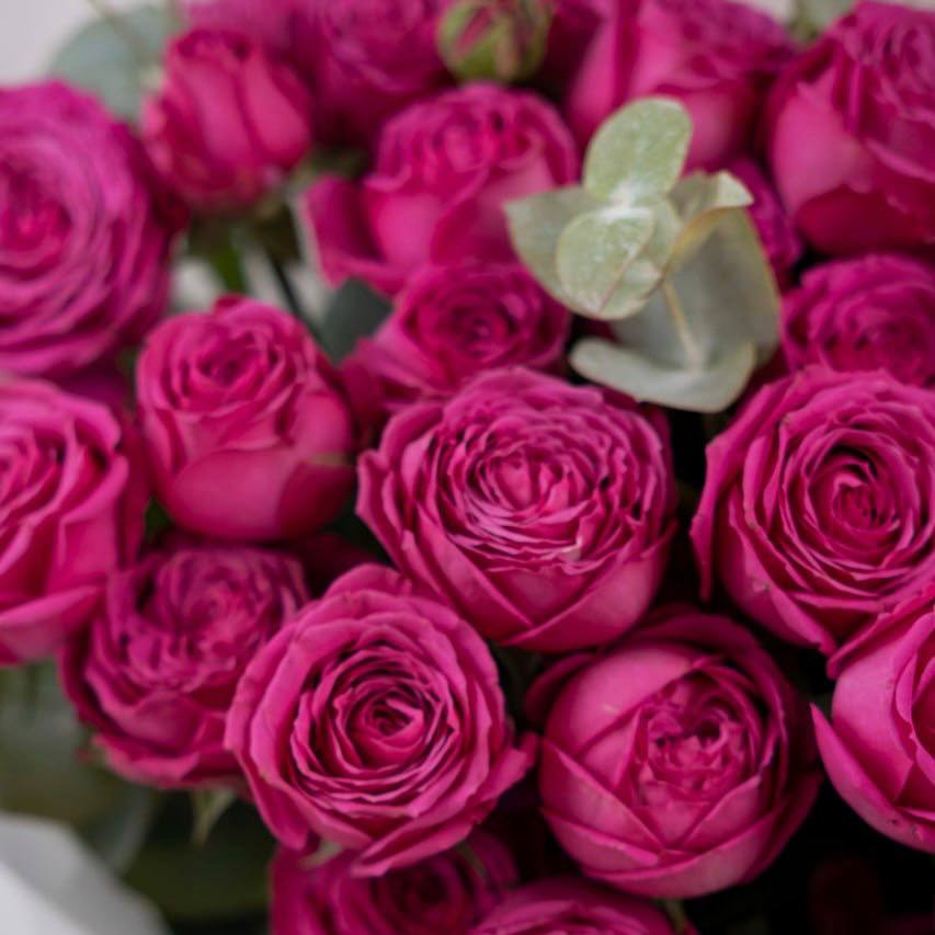 Роза кустовая пионовидная - 15 шт., Эвкалипт большой - 3 шт., Современная упаковка - 1 шт., Лента атласная - 1 шт.