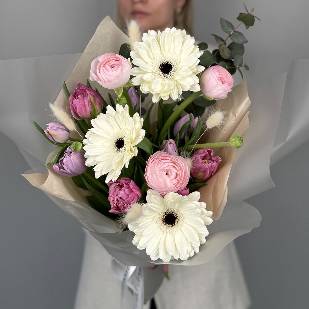 Гербера - 3 шт., Ранункулюс - 3 шт., Тюльпан - 9 шт., Сезонная зелень - 5 шт., Эвкалипт большой - 1 шт., Современная упаковка - 1 шт., Лента атласная - 1 шт.