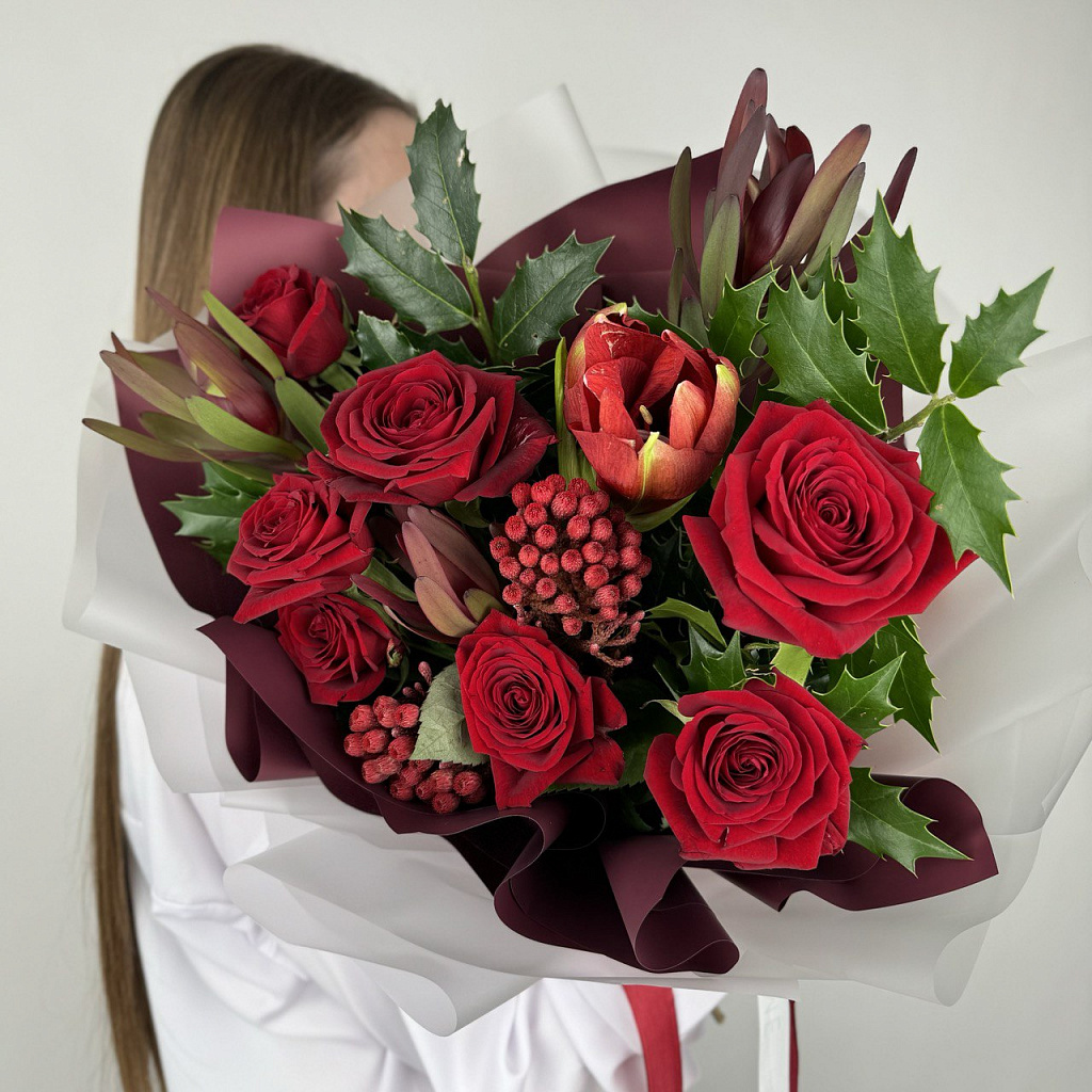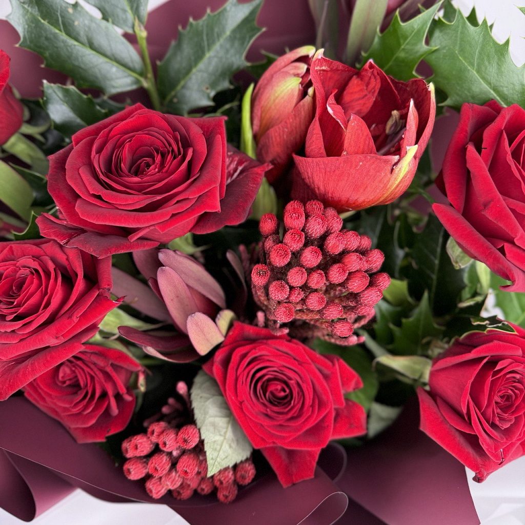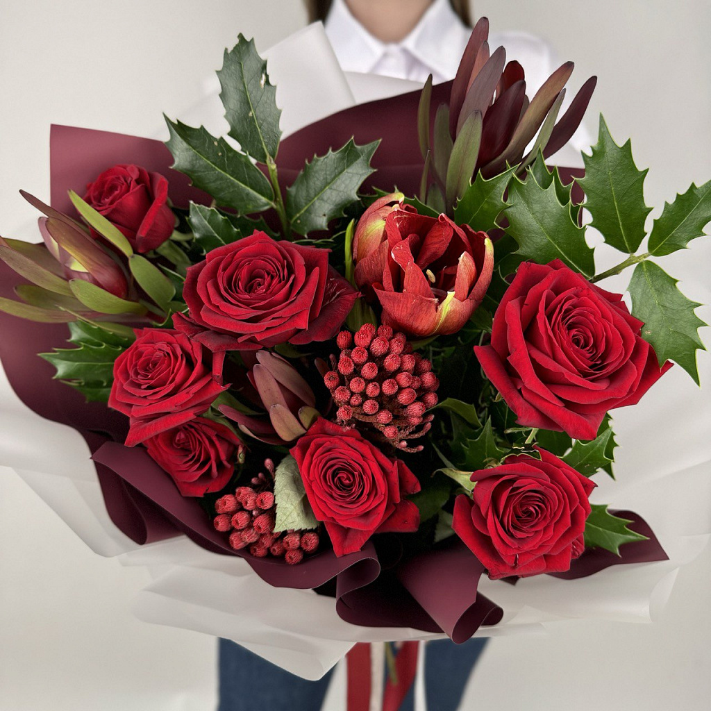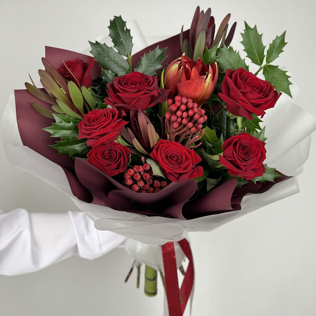 Роза Ред Наоми (50см) РОССИЯ - 7 шт., Бруния - 2 шт., Леукодендрон - 3 шт., Сезонная зелень - 5 шт., Современная упаковка - 1 шт., Лента атласная - 1 шт.