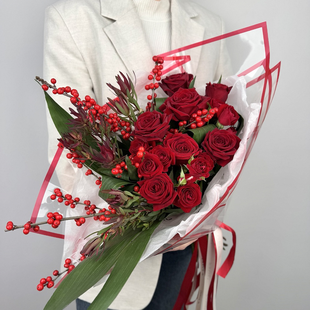 Роза кустовая пионовидная - 3 шт., Роза Ред Наоми (50см) РОССИЯ - 7 шт., Леукодендрон - 3 шт., Илекс - 2 шт., Аспидистра - 5 шт., Современная упаковка - 1 шт., Лента атласная - 2 шт.