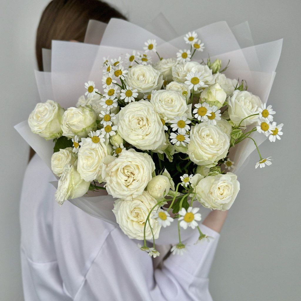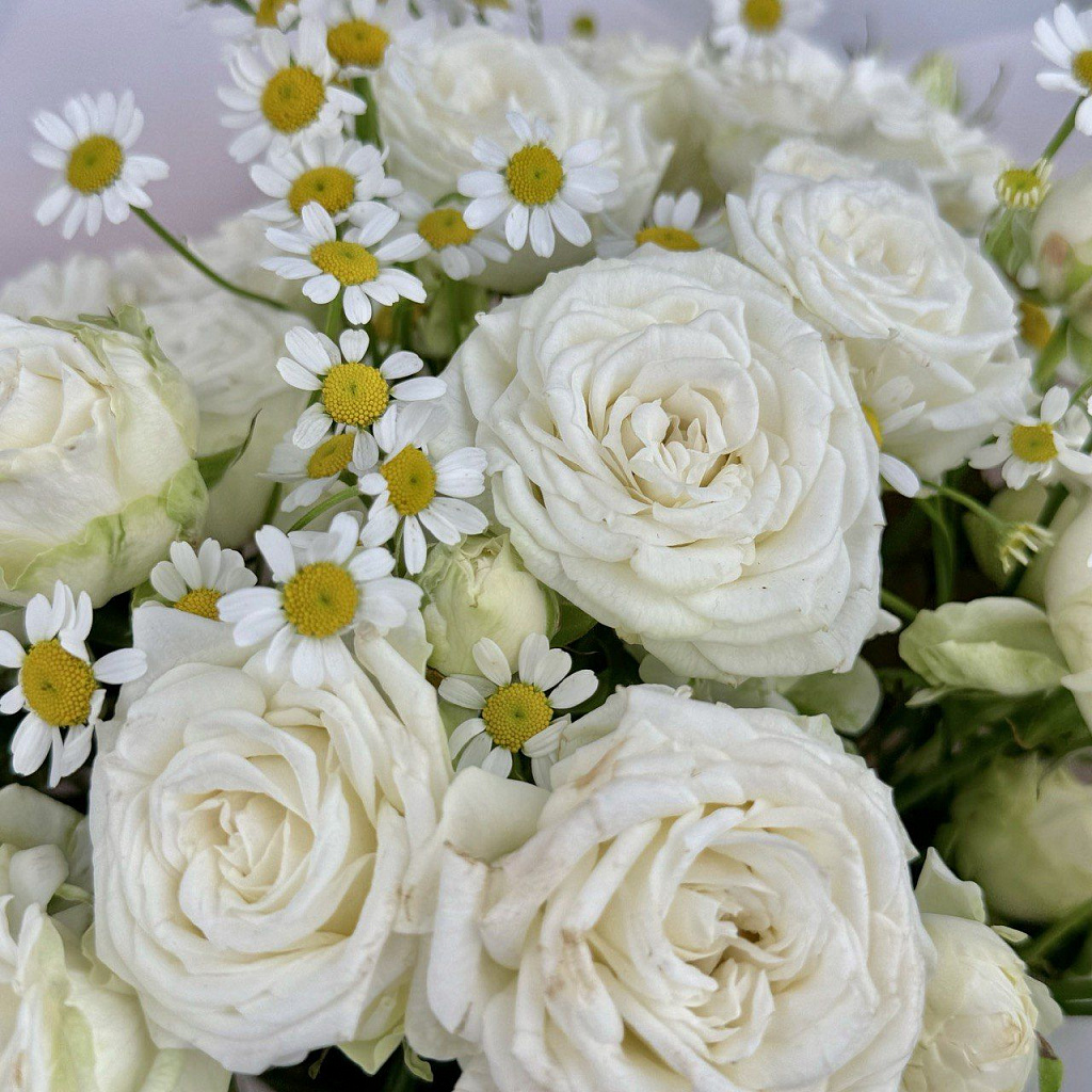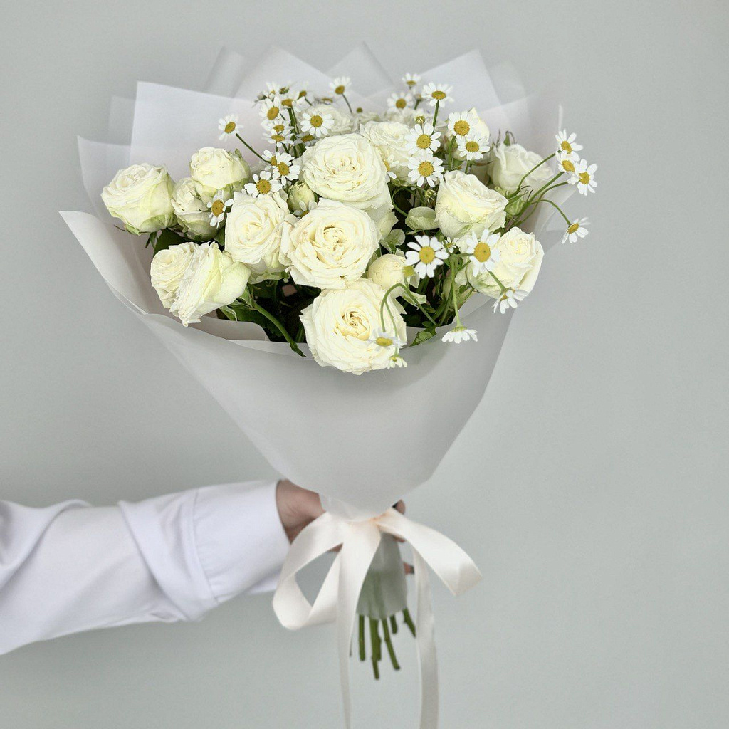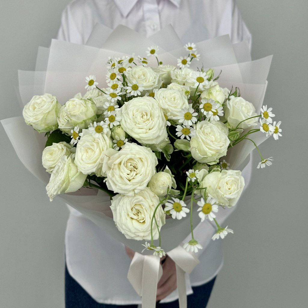 Лента атласная - 1 шт., Современная упаковка - 1 шт., Роза кустовая пионовидная - 7 шт., Танацетум - 2 шт.