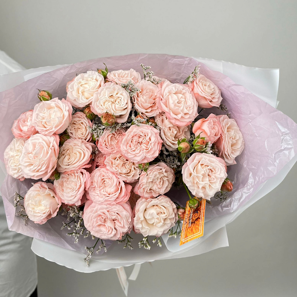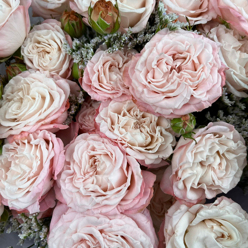 Роза кустовая пионовидная - 11 шт., Статица - 3 шт., Лента атласная - 1 шт., Современная упаковка - 1 шт.