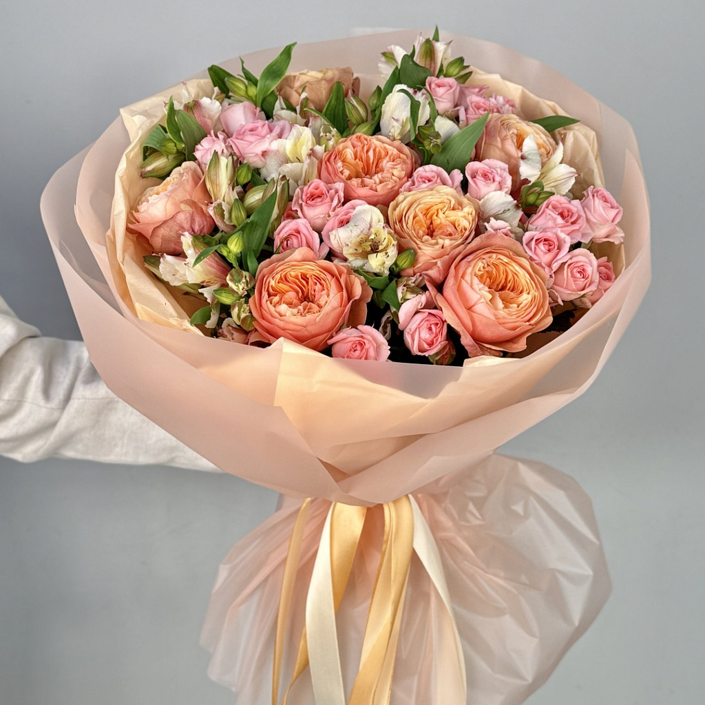 Современная упаковка - 1 шт., Лента атласная - 1 шт., Альстромерия - 4 шт., Роза кустовая - 7 шт., Роза Дорсет (50см) РОССИЯ - 7 шт.