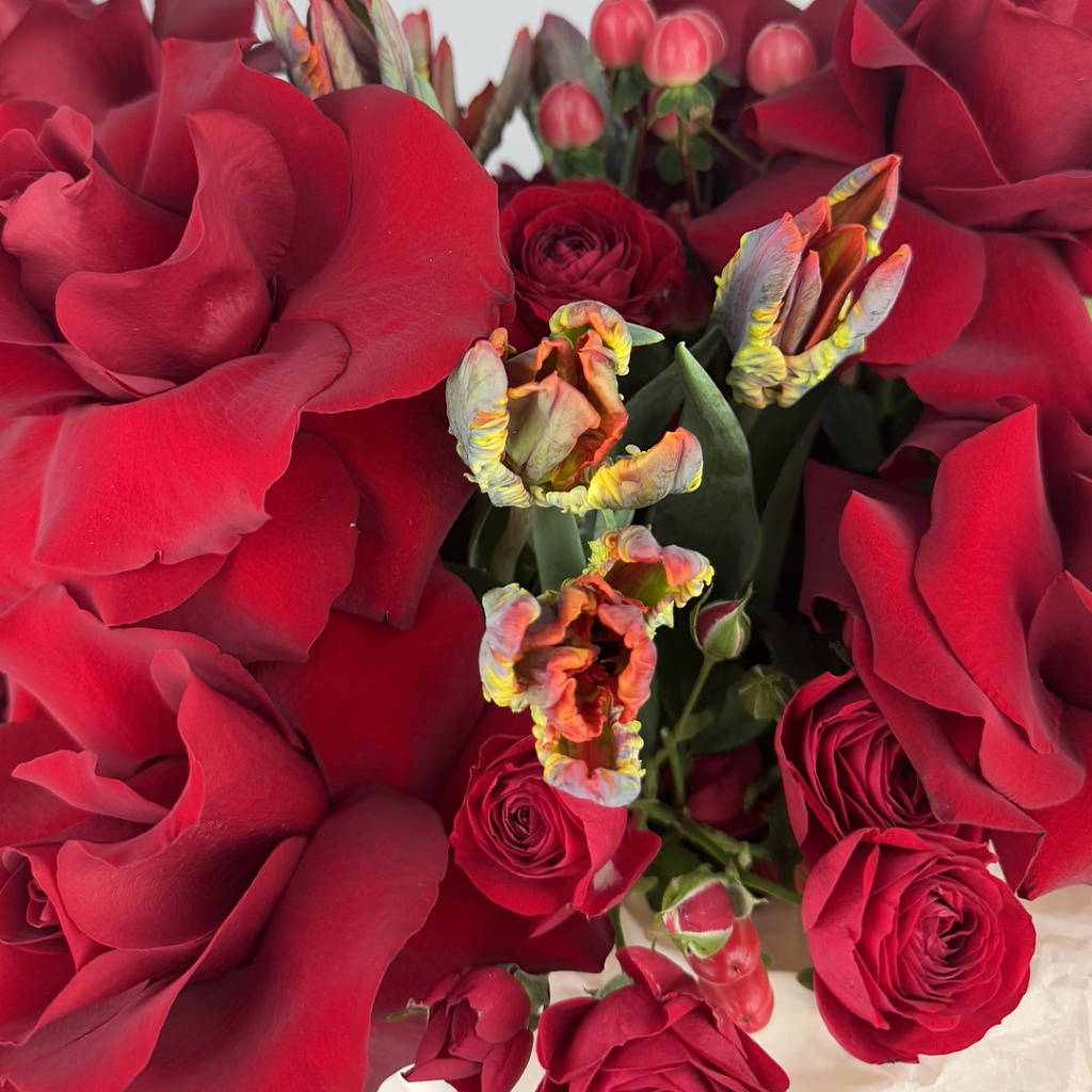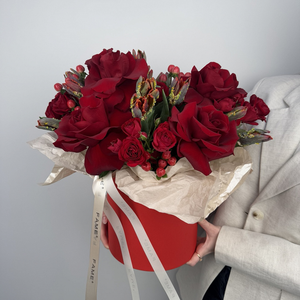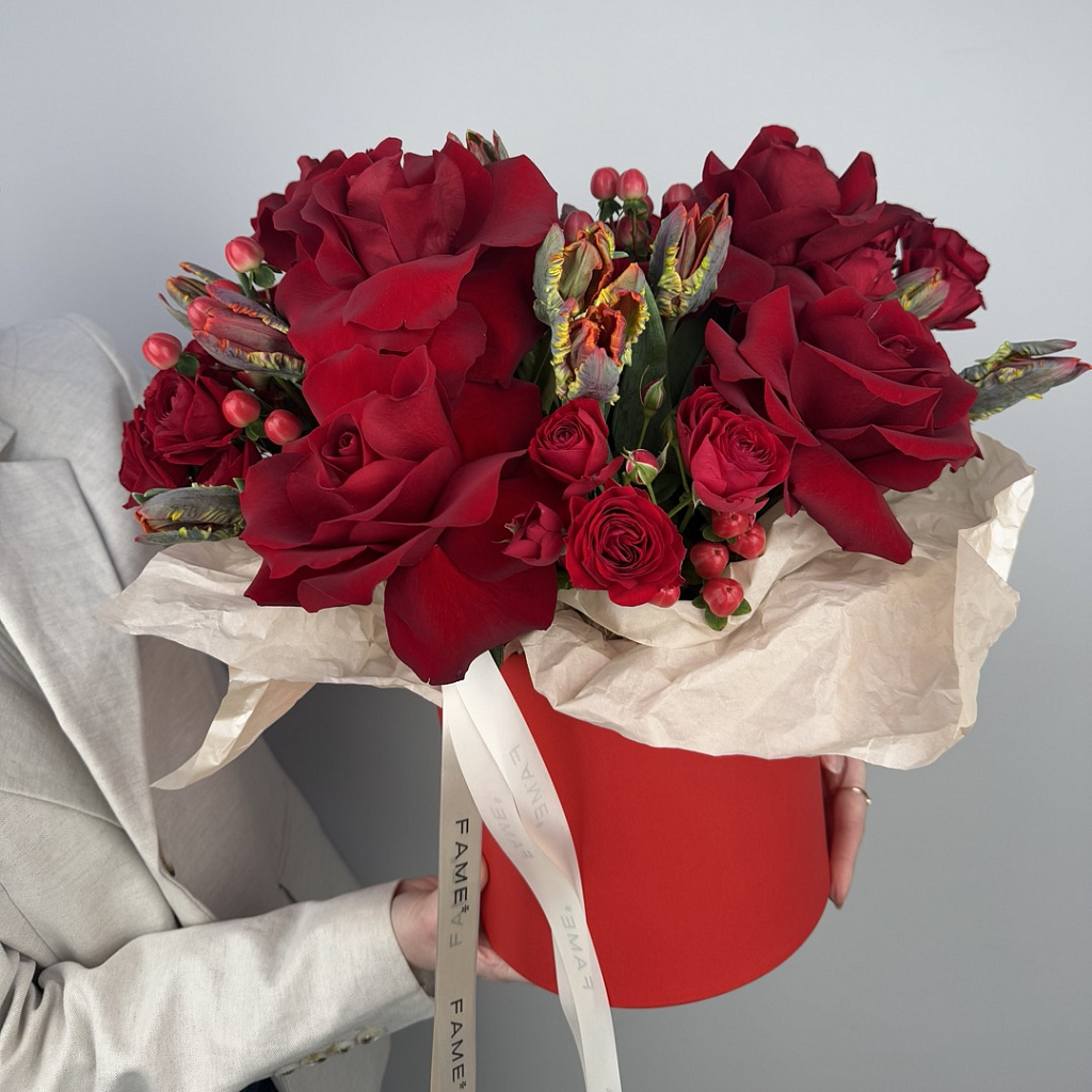 Коробка шляпная средняя (от 12 до 21 см) - 1 шт., Оазис - 1 шт., Роза 80 см (РОССИЯ) - 7 шт., Роза кустовая пионовидная - 5 шт., Гиперикум - 5 шт., Тюльпан - 14 шт.