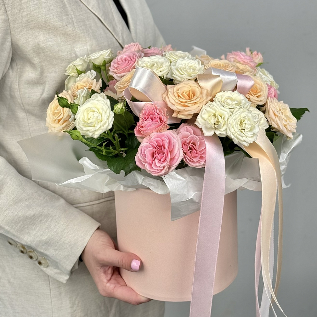 Шляпная коробка средняя - 1 шт., Оазис - 1 шт., Современная упаковка - 1 шт., Роза кустовая - 13 шт., Лента атласная - 2 шт.