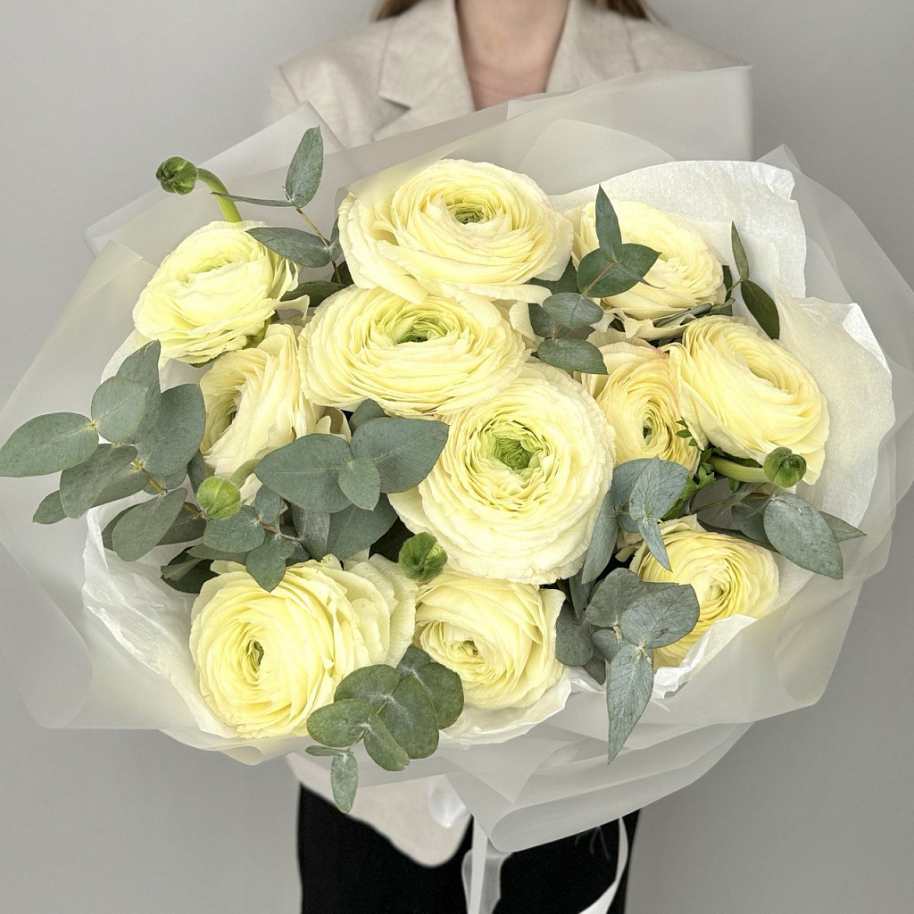 Лента атласная - 1 шт., Современная упаковка - 1 шт., Ранункулюс - 11 шт., Эвкалипт большой - 4 шт.