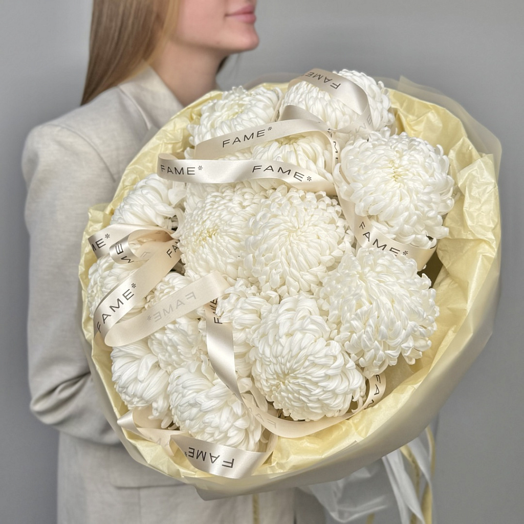 Хризантема одноголовая местная - 15 шт., Современная упаковка - 1 шт., Лента атласная - 2 шт.