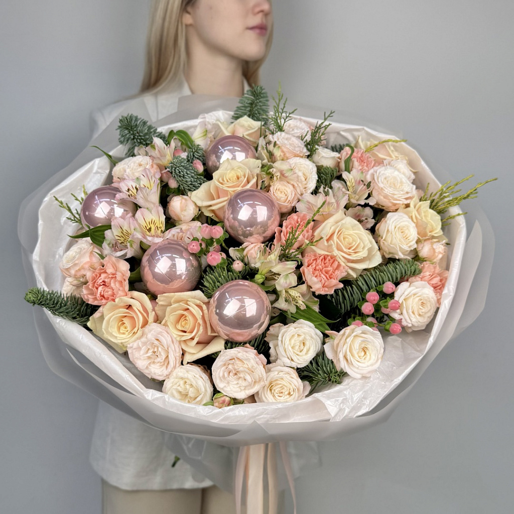 Роза кустовая пионовидная - 6 шт., Современная упаковка - 1 шт., Лента атласная - 1 шт., Роза Талеа (50см) РОССИЯ - 7 шт., Гвоздика одноголовая цветная - 3 шт., Альстромерия - 4 шт., Шар ёлочный - 5 шт., Нобилис - 1 шт., Хвоя - 1 шт., Гиперикум - 2 шт.