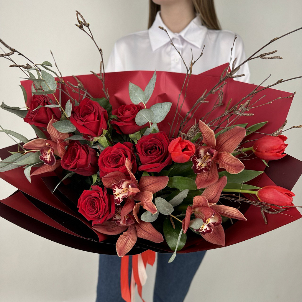 Современная упаковка - 1 шт., Лента атласная - 1 шт., Орхидея Бутон - 5 шт., Тюльпан - 3 шт., Роза Ред Наоми (50см) РОССИЯ - 7 шт., Сезонная зелень - 3 шт., Эвкалипт большой - 4 шт., Русскус отеч. - 9 шт.