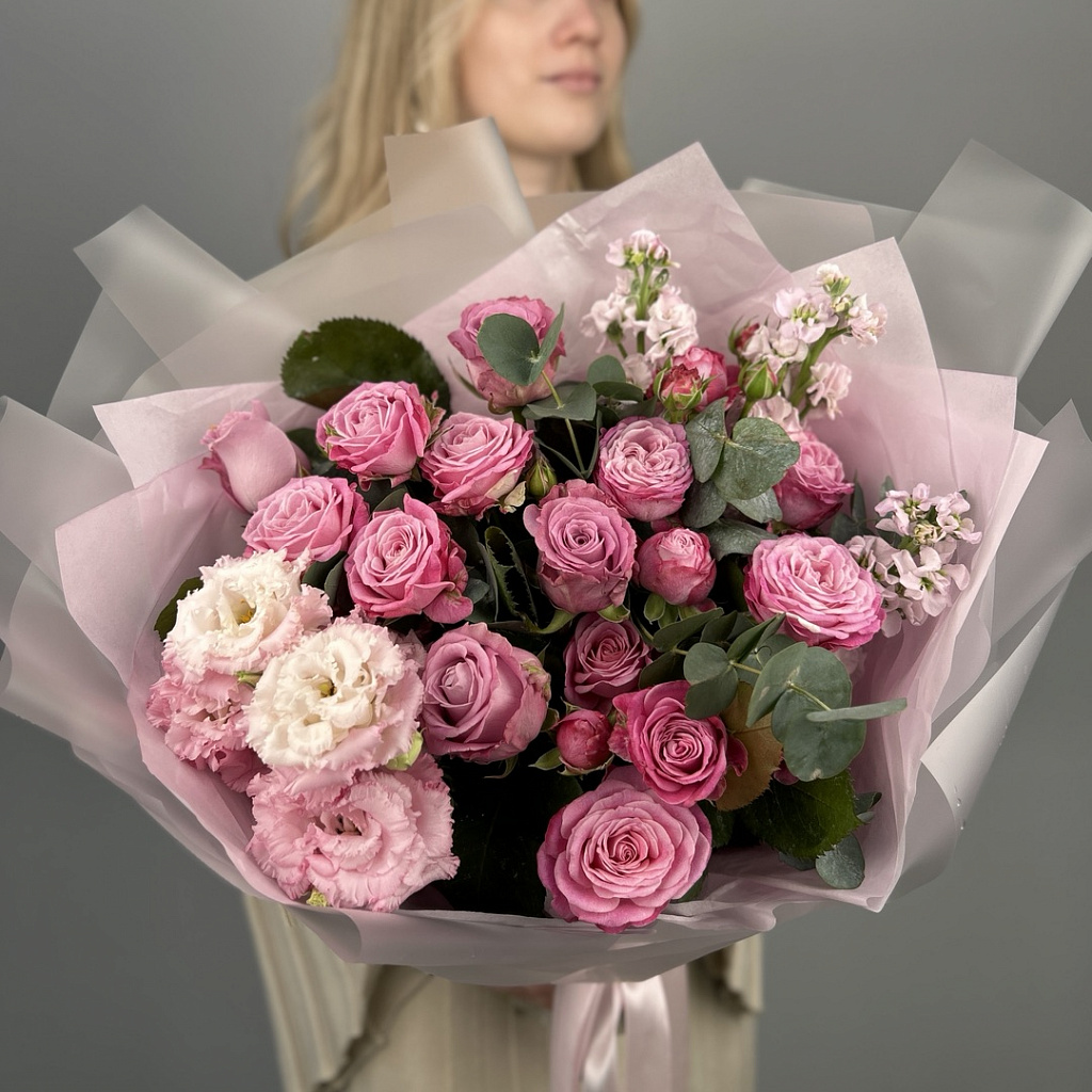 Роза кустовая пионовидная - 3 шт., Роза Маритим (50см) РОССИЯ - 5 шт., Эустома - 1 шт., Маттиола - 3 шт., Эвкалипт большой - 2 шт., Современная упаковка - 1 шт., Лента атласная - 1 шт.
