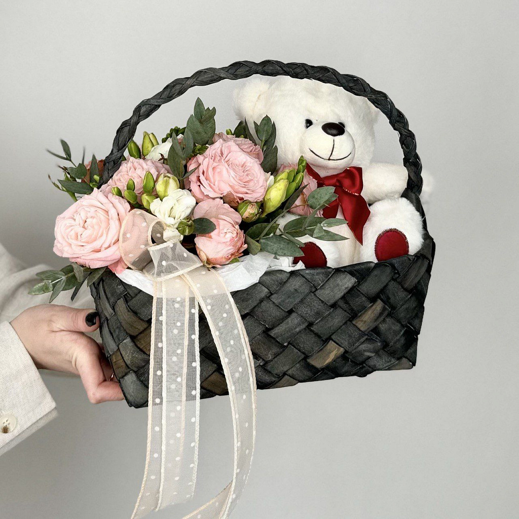 Корзина средняя (15-25 см) - 1 шт., Оазис - 0.5 шт., Мишка 15 см - 1 шт., Фрезия - 3 шт., Роза кустовая пионовидная - 3 шт., Эвкалипт большой - 2 шт.