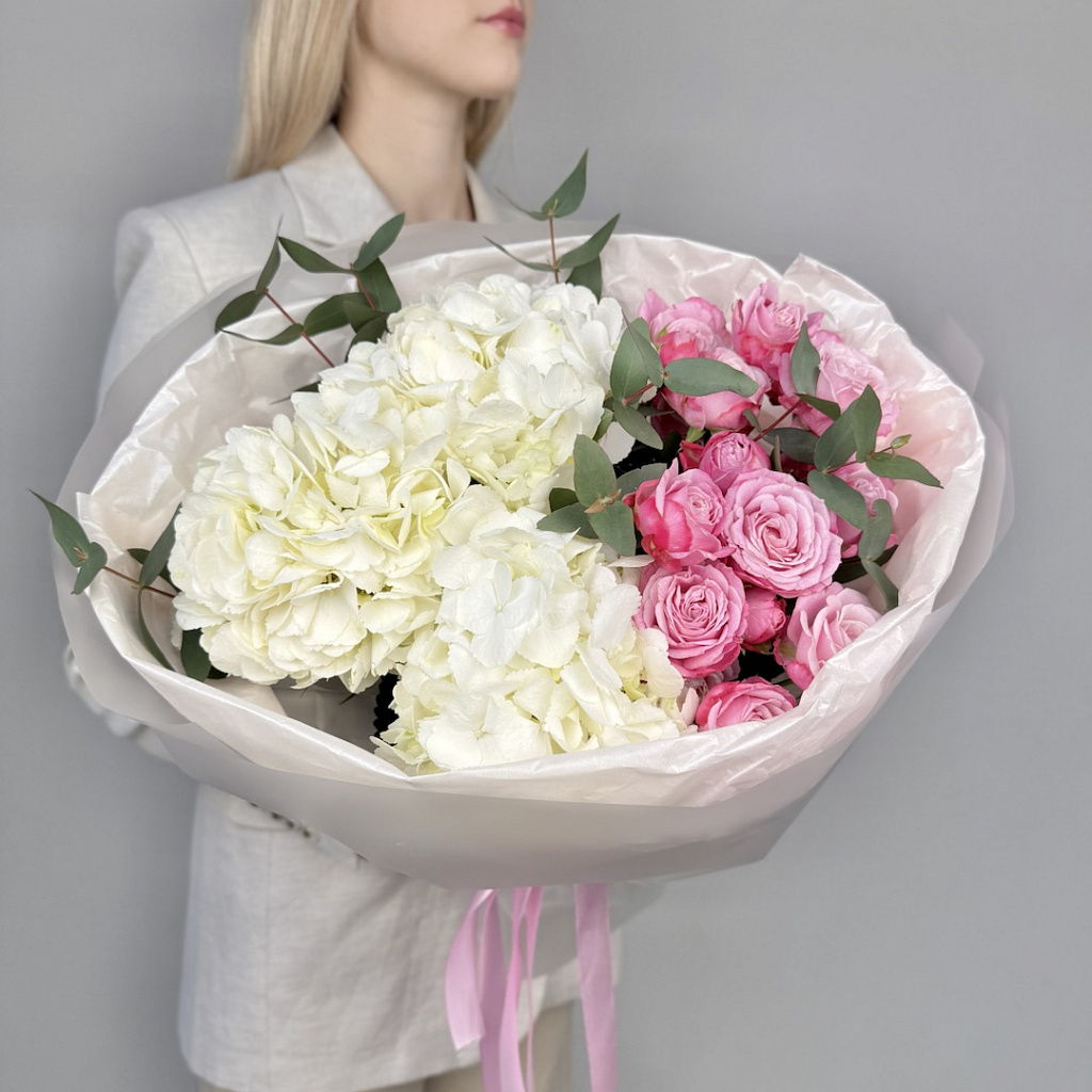 Современная упаковка - 1 шт., Лента атласная - 1 шт., Гортензия - 3 шт., Роза кустовая пионовидная - 3 шт., Эвкалипт большой - 1 шт.