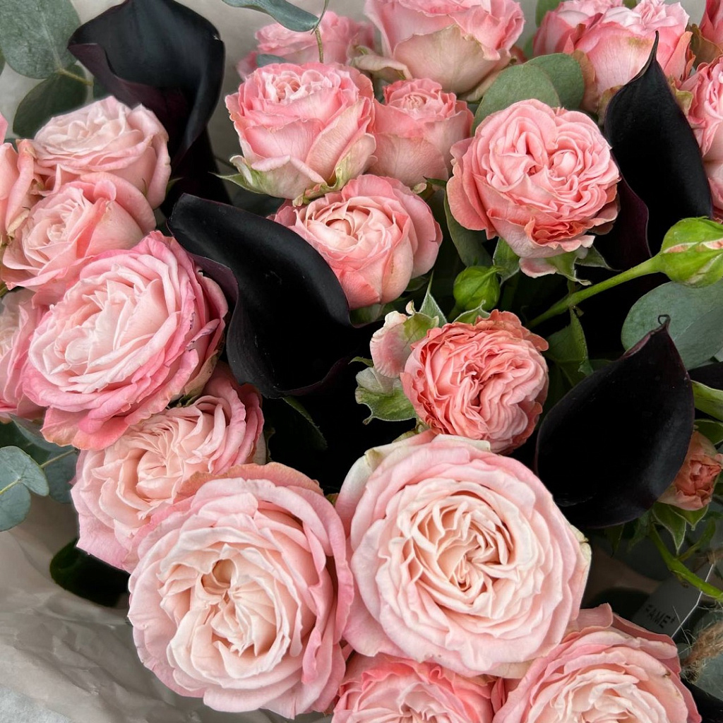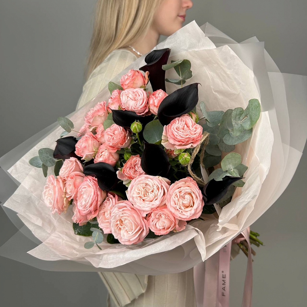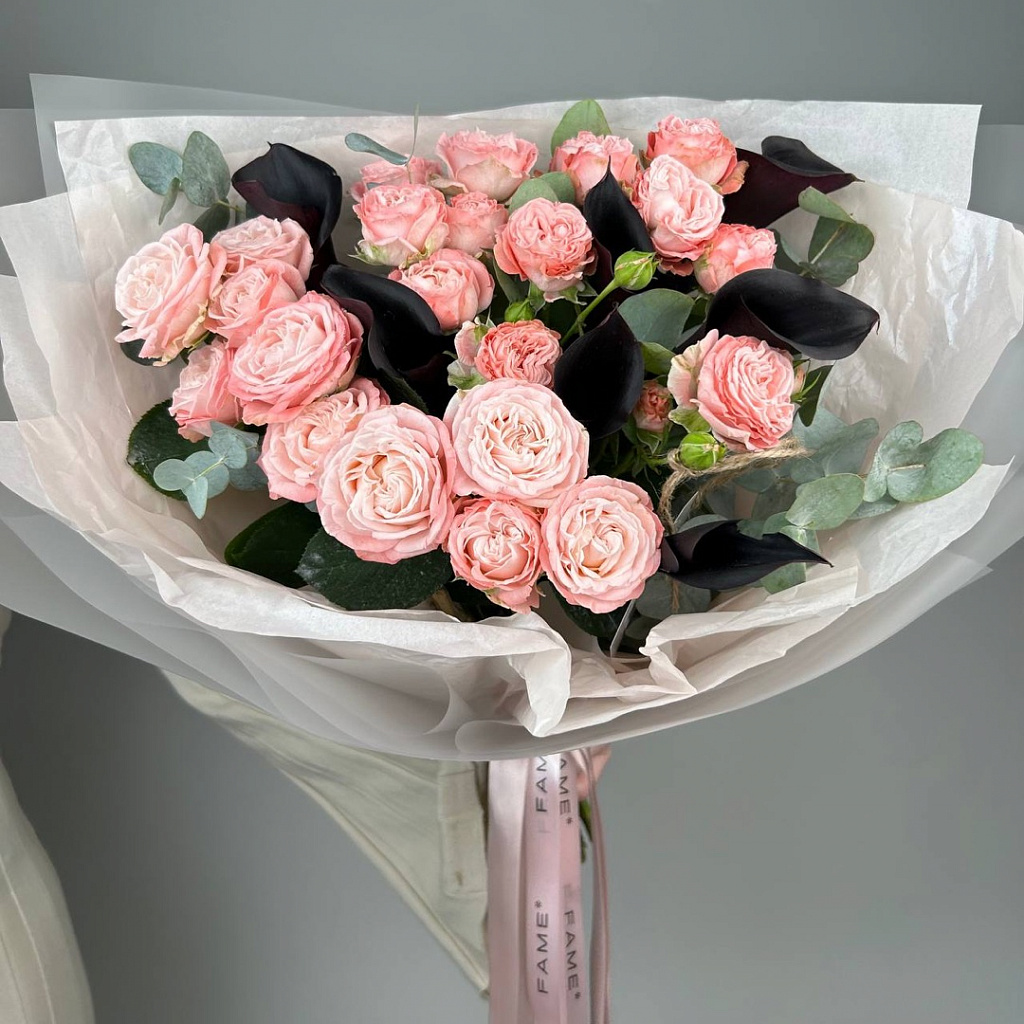 Калла - 7 шт., Роза кустовая пионовидная - 6 шт., Эвкалипт большой - 3 шт., Современная упаковка - 1 шт., Лента атласная - 1 шт.