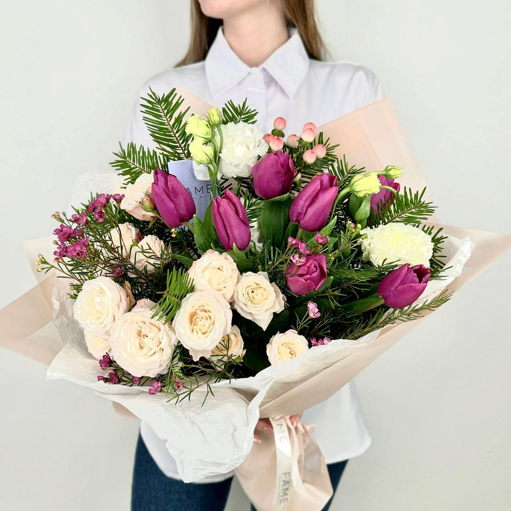 Пихта - 1 шт., Тюльпан - 7 шт., Хамелациум - 3 шт., Роза кустовая пионовидная - 4 шт., Эустома - 2 шт., Гиперикум - 1 шт., Современная упаковка - 1 шт., Лента атласная - 1 шт.