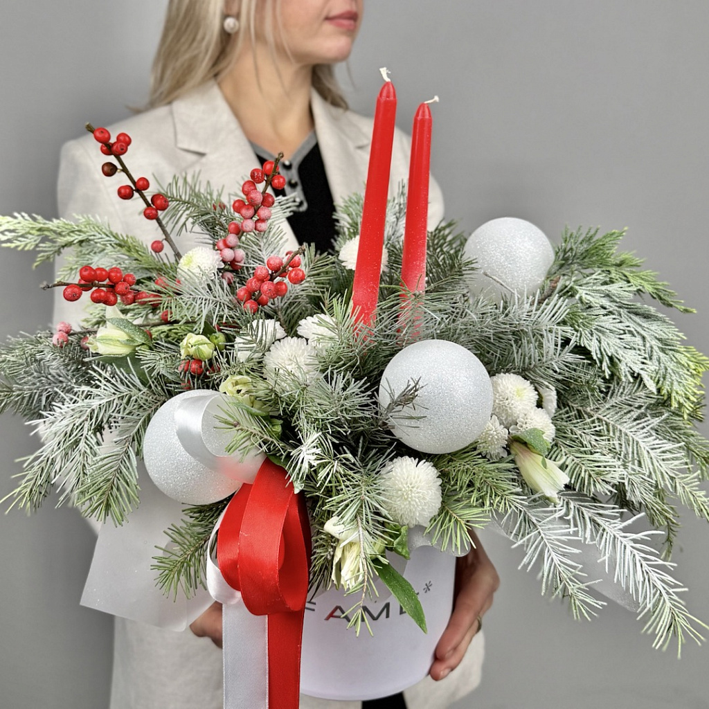 Коробка шляпная средняя (от 12 до 21 см) - 1 шт., Оазис - 1 шт., Шар ёлочный - 3 шт., Свеча - 2 шт., Нобилис - 3 шт., Хвоя - 1 шт., Альстромерия - 1 шт., Илекс - 1 шт., Хризантема кустовая местная - 2 шт., Лента атласная - 1 шт.