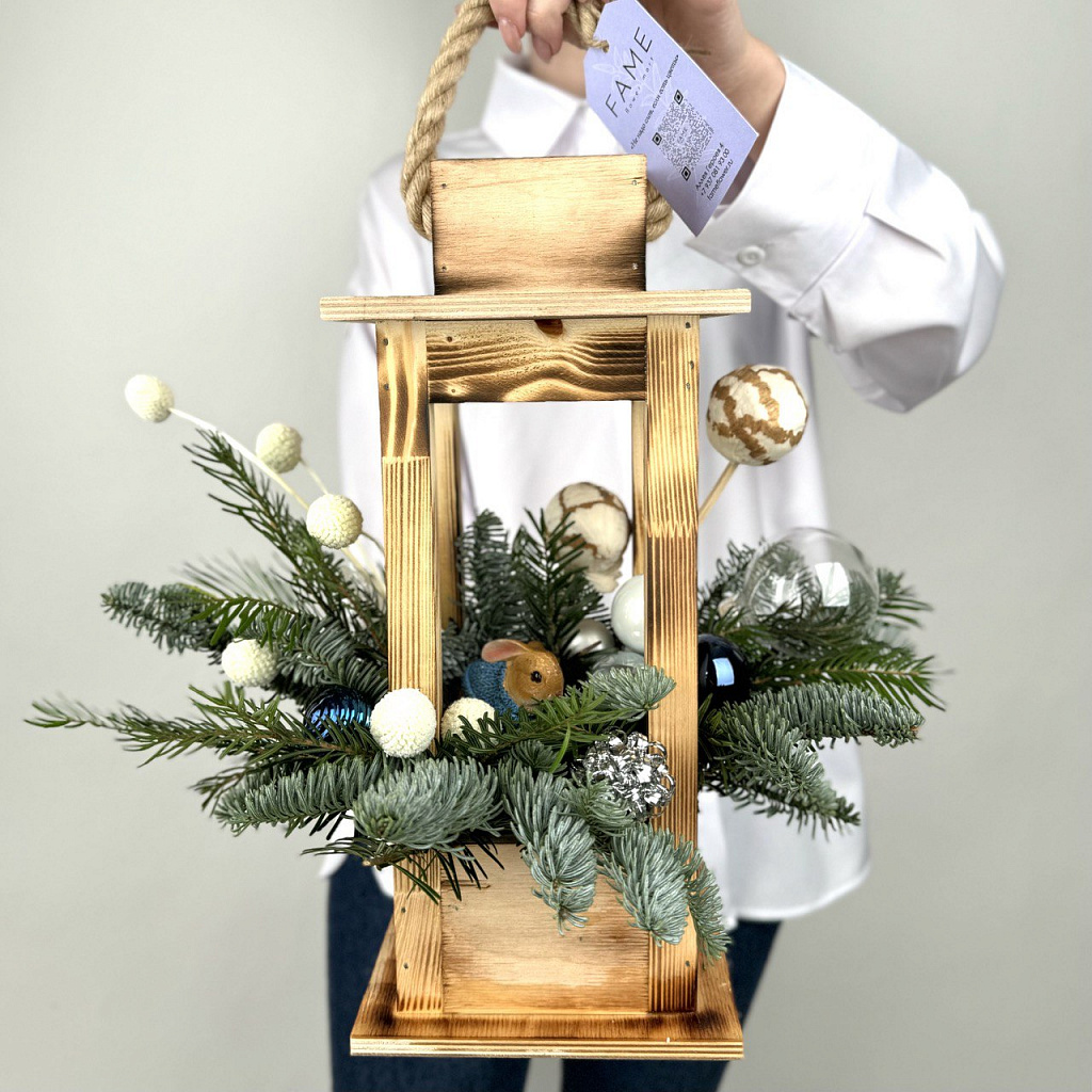 Нобилис - 1 шт., Оазис - 0.3 шт., Новогодний декор - 8 шт., Шар ёлочный - 9 шт., Кашпо Цветочный Фонарь 15*15*35 - 1 шт., Пихта - 1 шт.