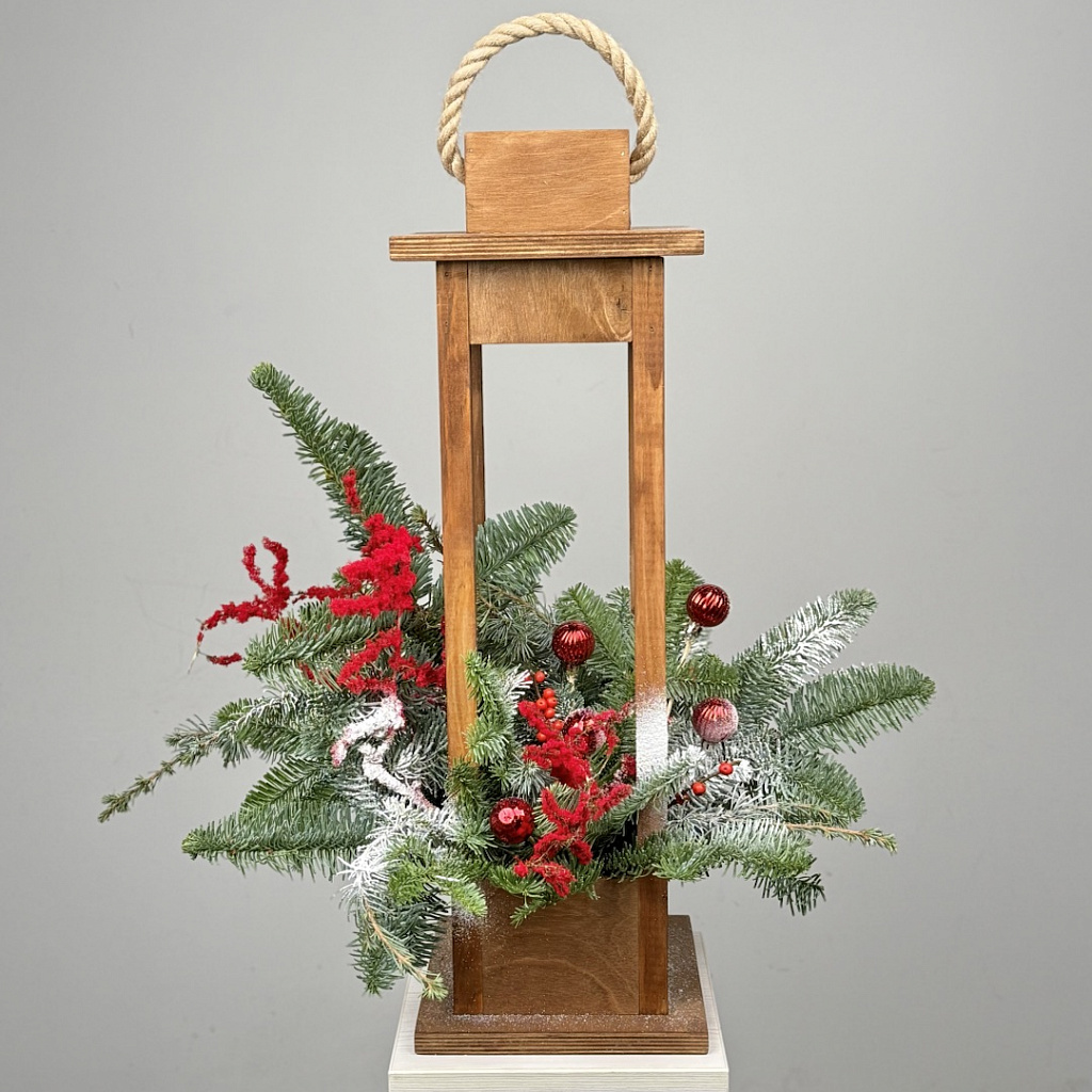 Оазис - 1 шт., Кашпо Цветочный Фонарь 15*15*35 - 1 шт., Нобилис - 2 шт., Шар ёлочный - 5 шт., Хвоя - 1 шт.