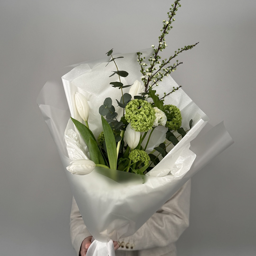 Тюльпан - 5 шт., Эвкалипт большой - 1 шт., Ранункулюс - 1 шт., Лента атласная - 1 шт., Современная упаковка - 1 шт., Прунус - 1 шт., Вибурнум - 1 шт.