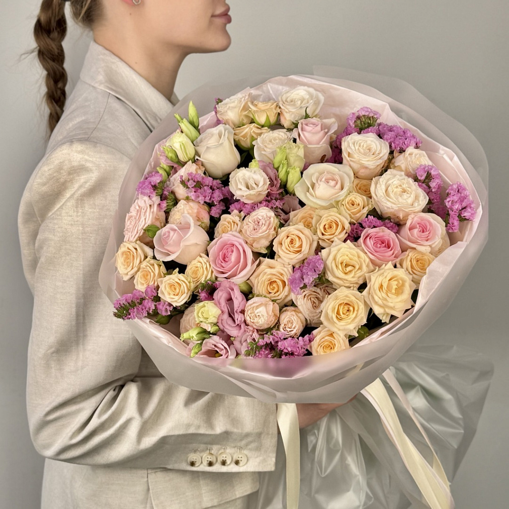 Современная упаковка - 1 шт., Лента атласная - 1 шт., Роза кустовая - 5 шт., Статица - 2 шт., Роза кустовая пионовидная - 5 шт., Роза Свит Ревайвл (50см) РОССИЯ - 7 шт., Эустома - 4 шт.