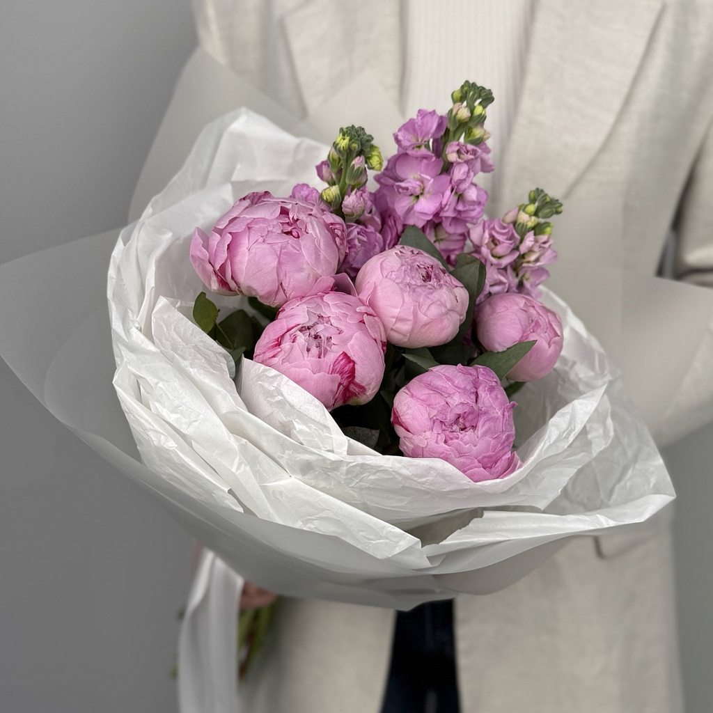 Маттиола - 3 шт., Пион - 5 шт., Эвкалипт большой - 3 шт., Пленка листовая - 3 шт., Современная упаковка - 1 шт., Лента атласная - 1 шт.