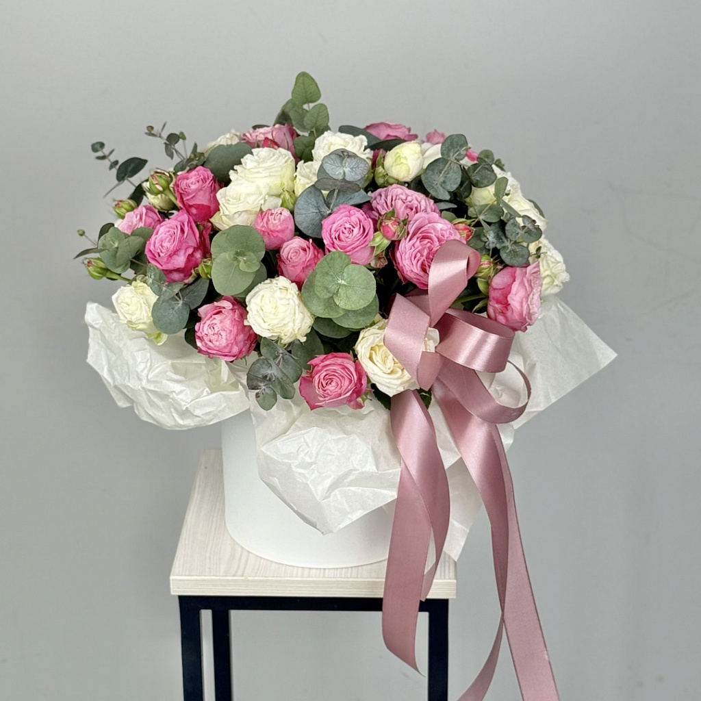 Коробка шляпная средняя (от 12 до 21 см) - 1 шт., Оазис - 1 шт., Лента атласная - 1 шт., Эвкалипт большой - 2 шт., Роза кустовая пионовидная - 9 шт.