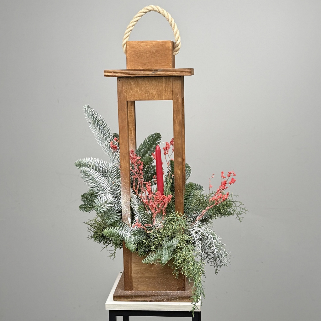 Оазис - 1 шт., Свеча - 1 шт., Хвоя - 1 шт., Нобилис - 1 шт., Сезонная зелень - 2 шт., Кашпо Цветочный Фонарь 15*15*35 - 1 шт.