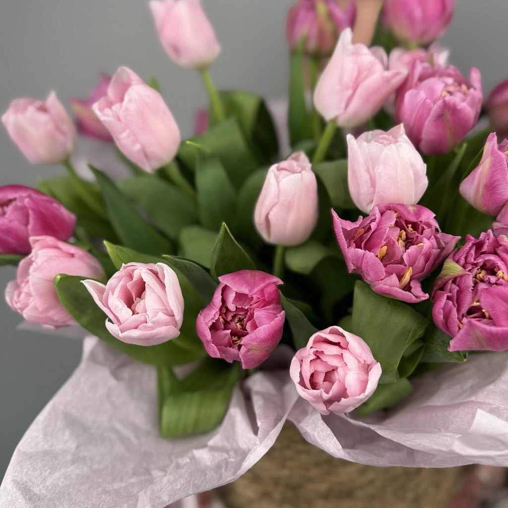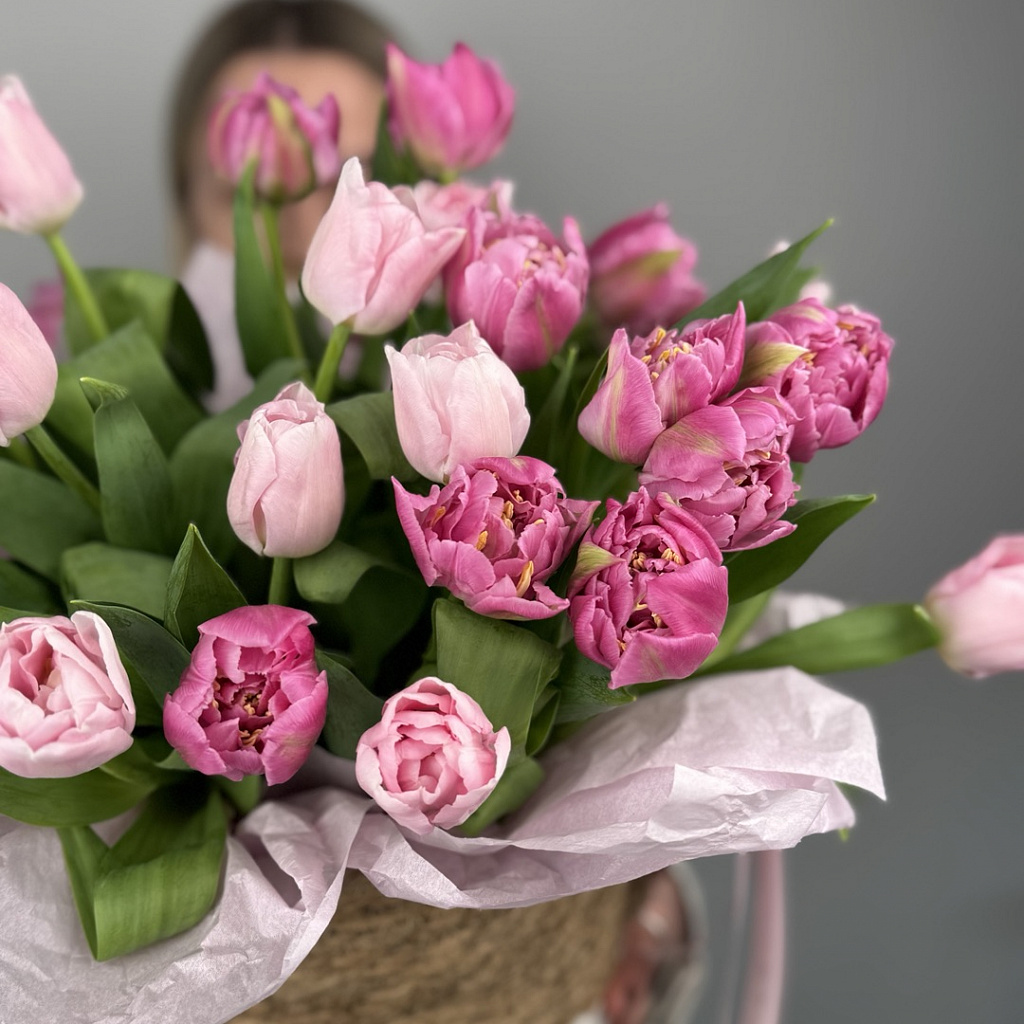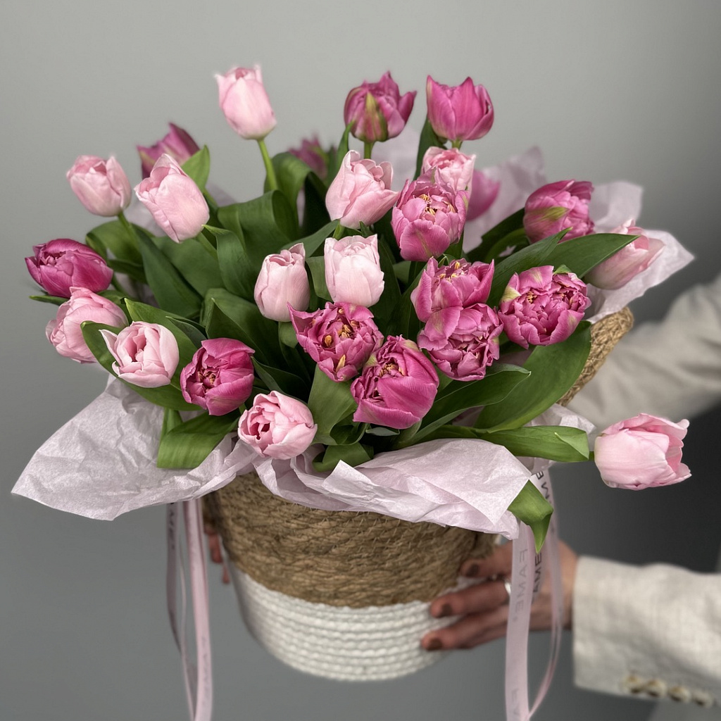Корзина плетеная 1500 - 1 шт., Тюльпан - 25 шт., Сезонная зелень - 5 шт., Лента атласная - 2 шт., Оазис - 1 шт.