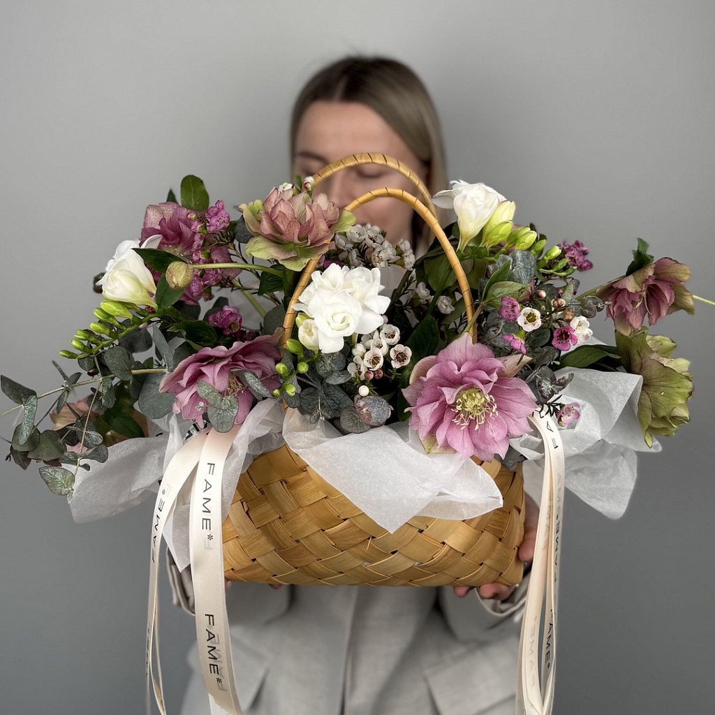 Корзина плетеная 1500 - 1 шт., Оазис - 1 шт., Лента атласная - 2 шт., Морозник - 3 шт., Эвкалипт большой - 2 шт., Хамелациум - 2 шт., Фрезия - 3 шт., Пленка листовая - 2 шт.
