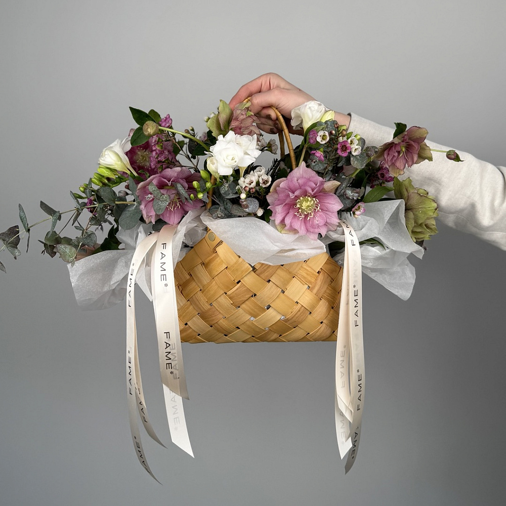 Корзина плетеная 1500 - 1 шт., Оазис - 1 шт., Лента атласная - 2 шт., Морозник - 3 шт., Эвкалипт большой - 2 шт., Хамелациум - 2 шт., Фрезия - 3 шт., Пленка листовая - 2 шт.