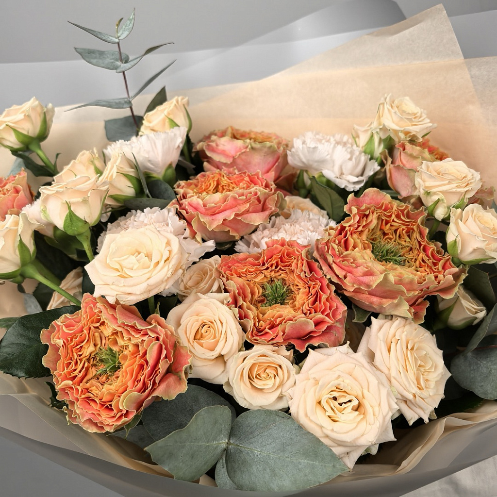 Упаковочный материал - 2 шт., Лента атласная - 1 шт., Роза кустовая - 7 шт., Роза Луиза (50см) РОССИЯ - 7 шт., Гвоздика одноголовая - 5 шт., Эвкалипт большой - 3 шт.