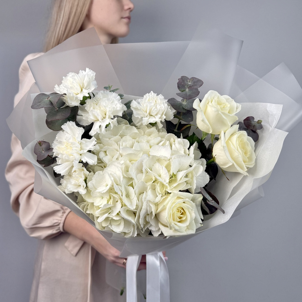 Гортензия - 1 шт., Современная упаковка - 1 шт., Лента атласная - 1 шт., Гвоздика одноголовая цветная - 5 шт., Роза Аваланж (50см) РОССИЯ - 3 шт., Эвкалипт большой - 2 шт.