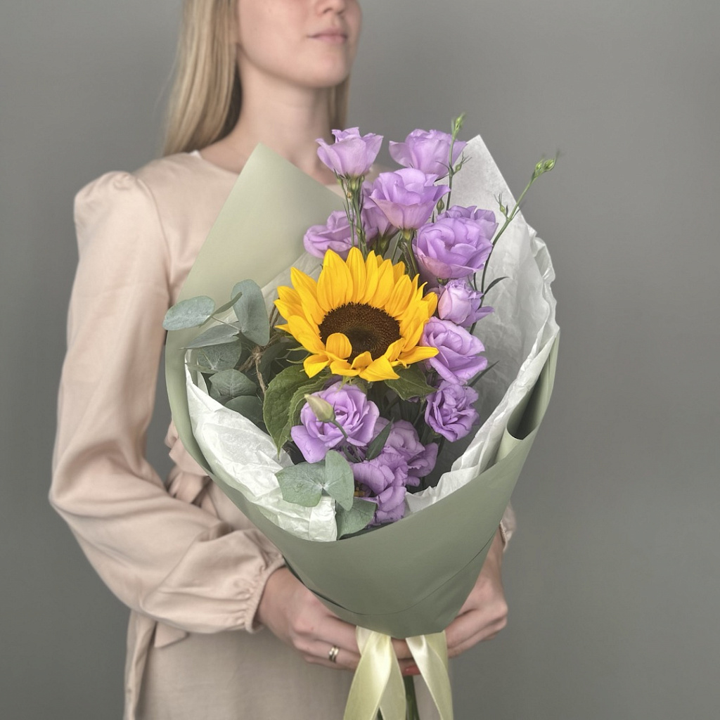 Современная упаковка - 1 шт., Лента атласная - 1 шт., Эвкалипт большой - 1 шт., Эустома - 3 шт., Подсолнух - 1 шт.