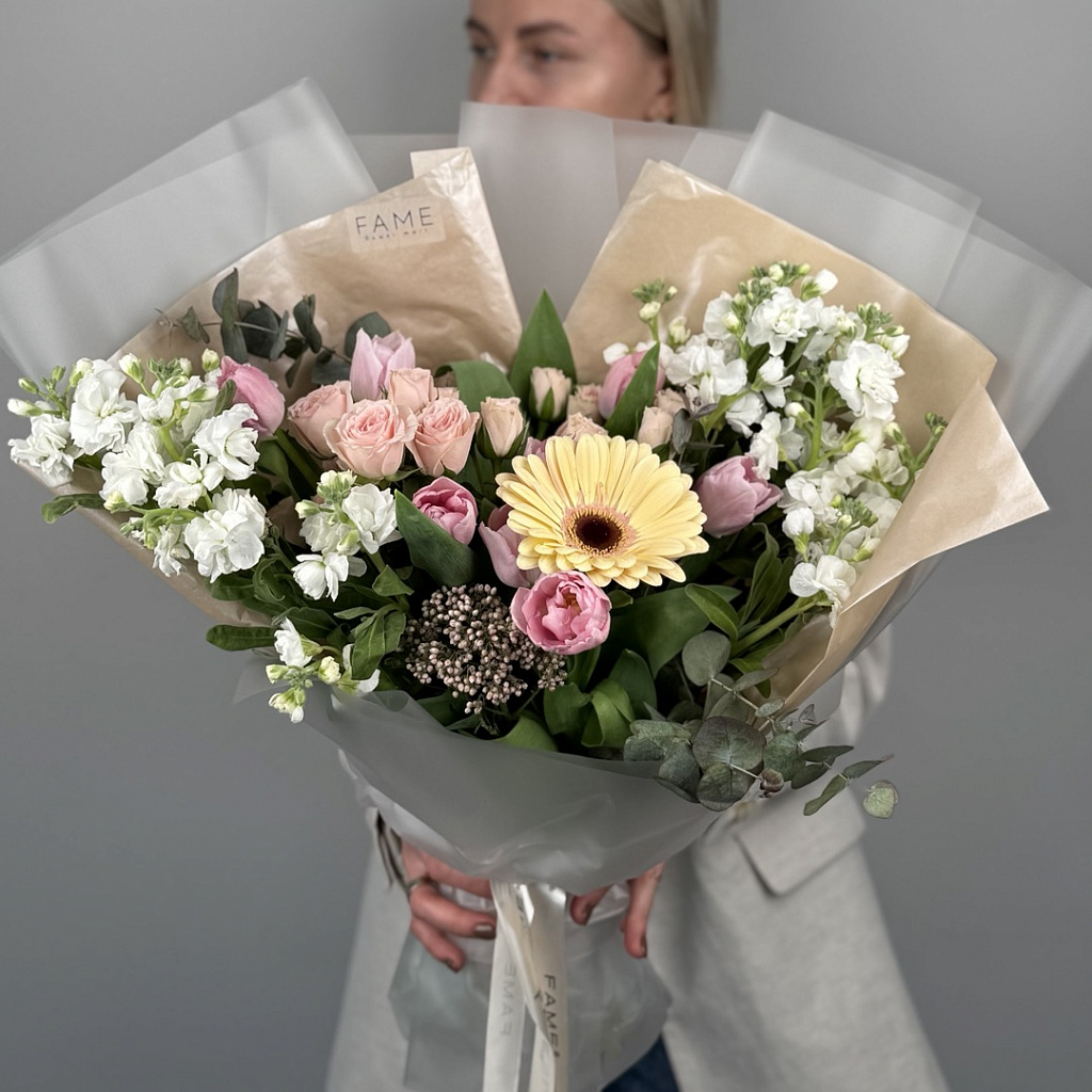 Букет, в который вложено много любви. Флористы студии FAME сделали его из самых свежих цветов, тщательно продумав состав. Теперь он готов удивить красотой своего получателя!
