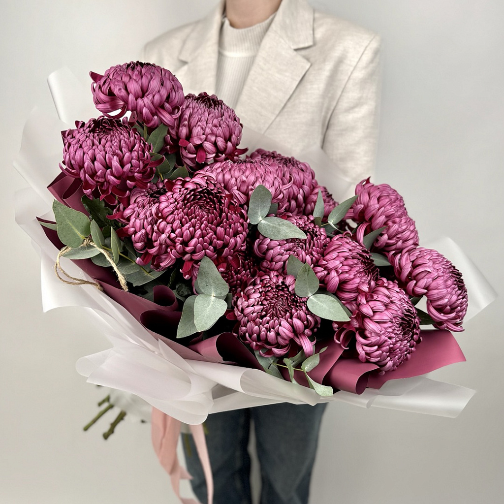 Хризантема одноголовая местная - 15 шт., Современная упаковка - 1 шт., Эвкалипт большой - 7 шт., Лента атласная - 1 шт.
