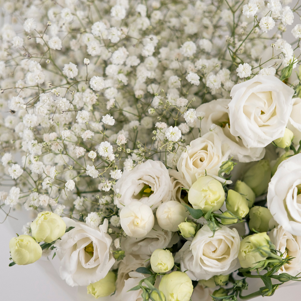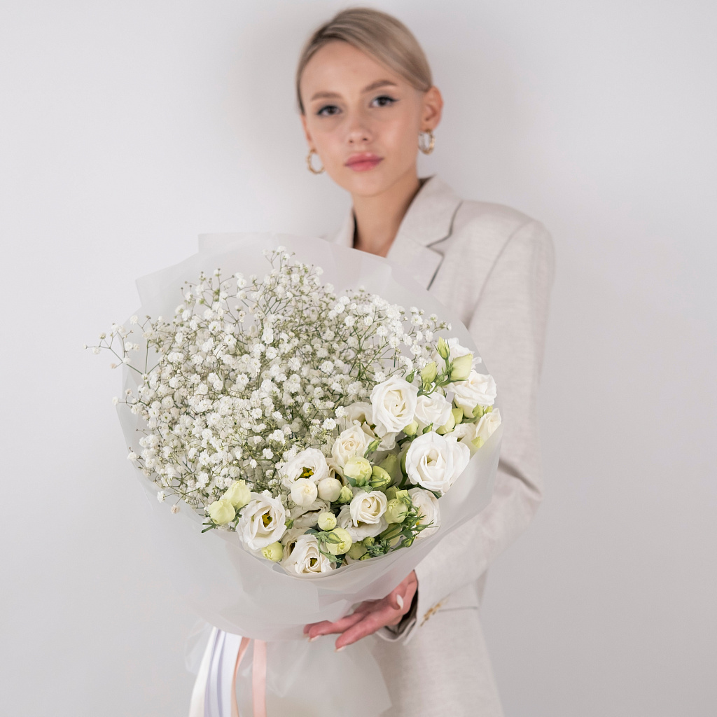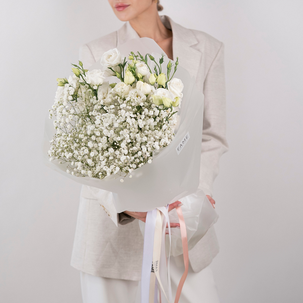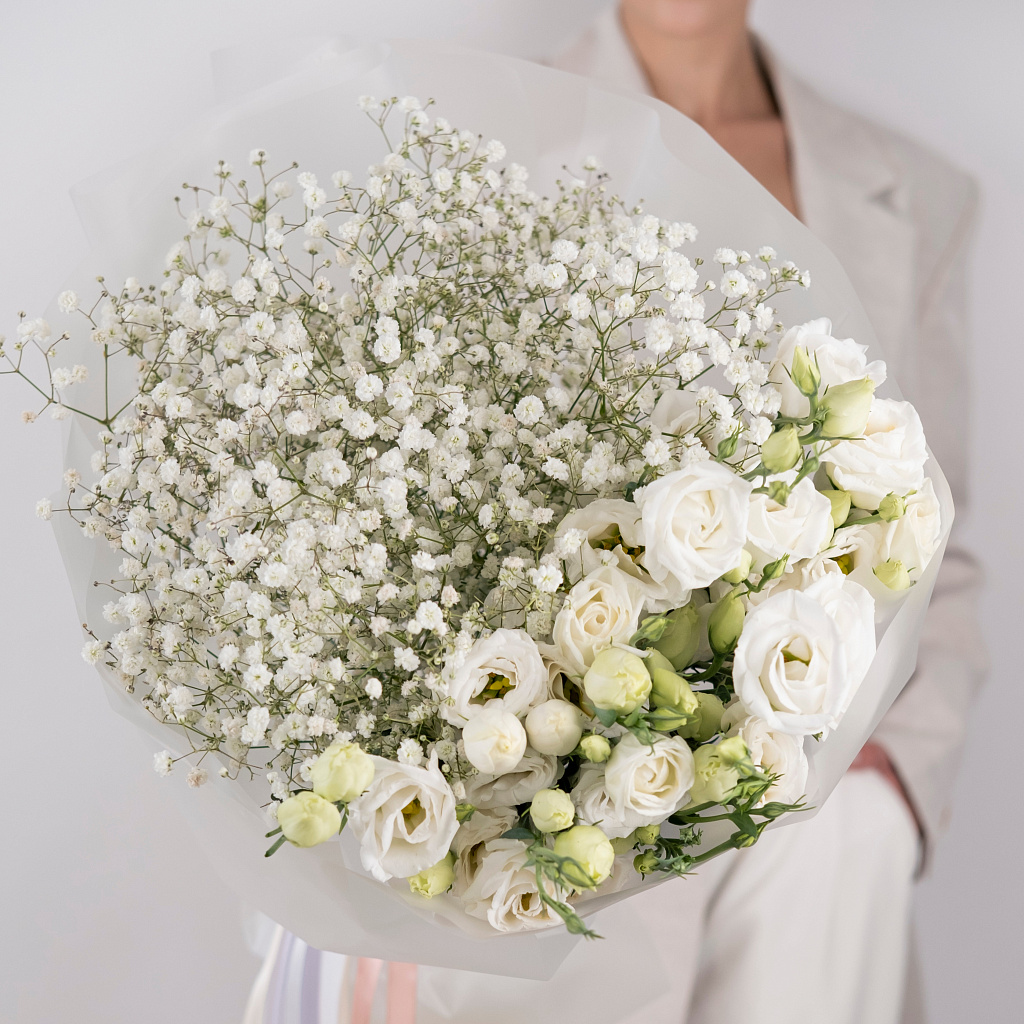 Эустома - 5 шт., Гипсофила - 3 шт., Лента атласная - 5 шт., Современная упаковка - 5 шт.