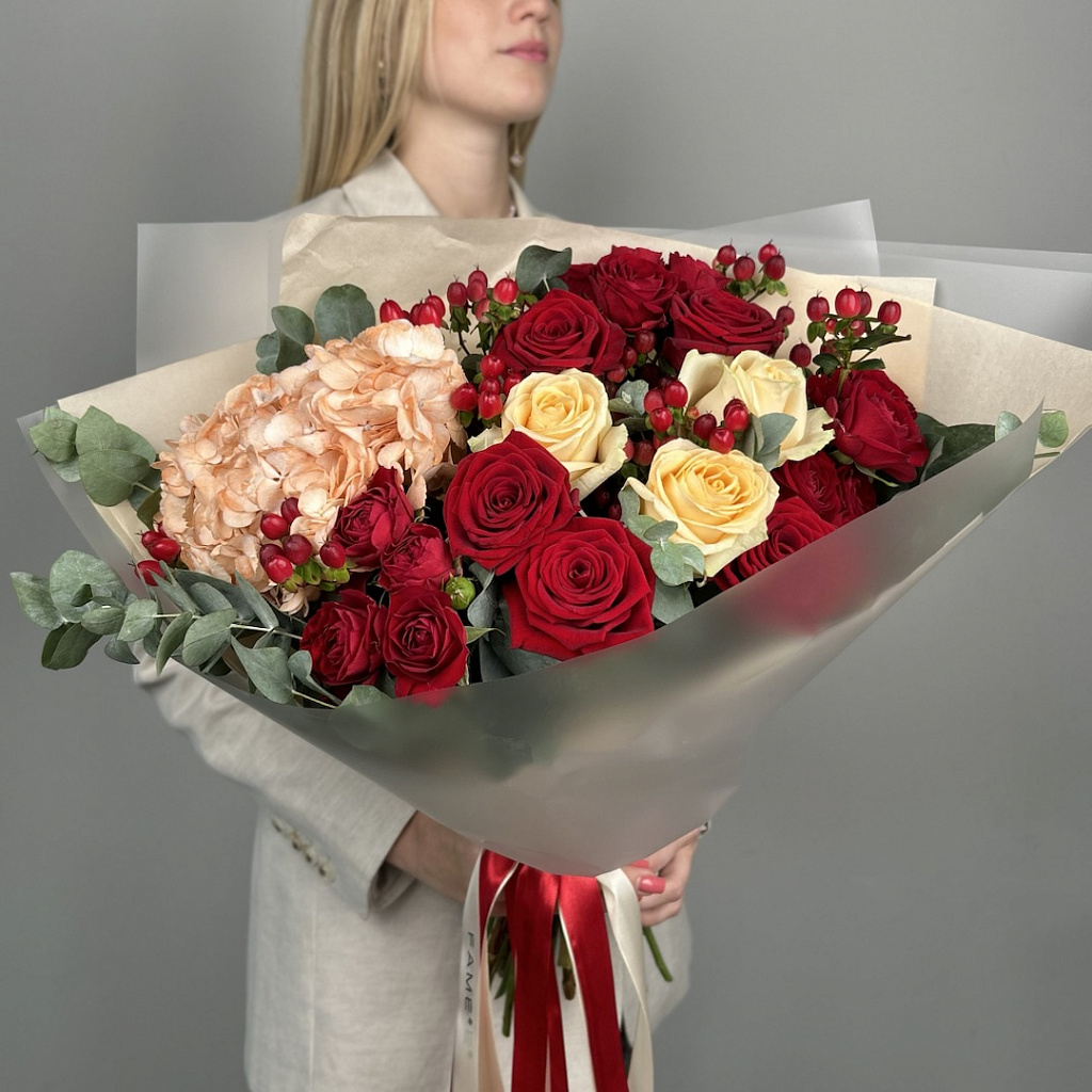 Упаковочный материал - 1 шт., Лента атласная - 1 шт., Гортензия - 1 шт., Роза Аваланж (50см) РОССИЯ - 3 шт., Роза Ред Наоми (50см) РОССИЯ - 6 шт., Роза кустовая пионовидная - 4 шт., Гиперикум - 3 шт., Эвкалипт большой - 3 шт.
