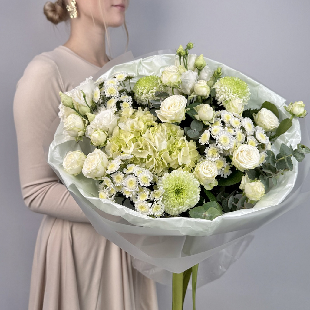 Гортензия - 1 шт., Хризантема одноголовая - 3 шт., Эустома - 2 шт., Роза кустовая пионовидная - 4 шт., Хризантема кустовая белая - 3 шт., Эвкалипт большой - 2 шт., Современная упаковка - 1 шт., Лента атласная - 1 шт.