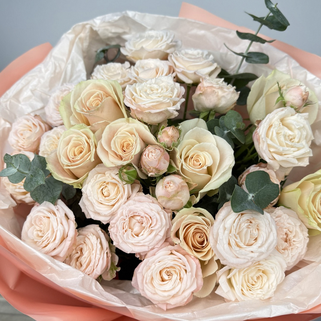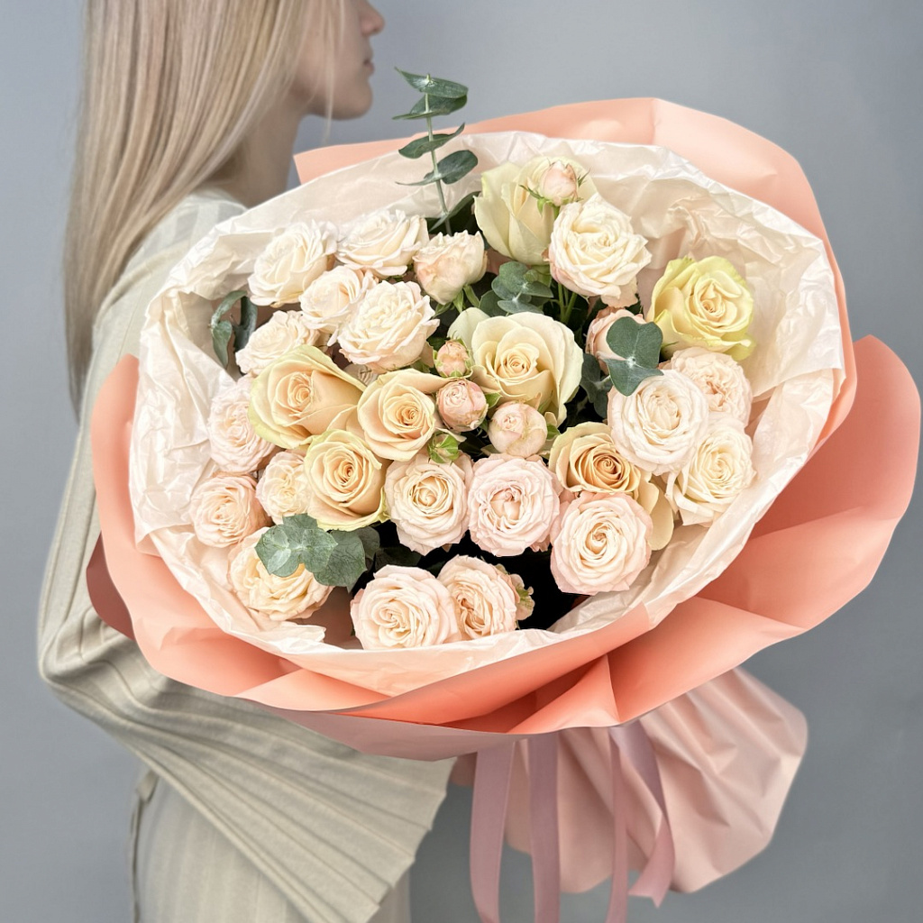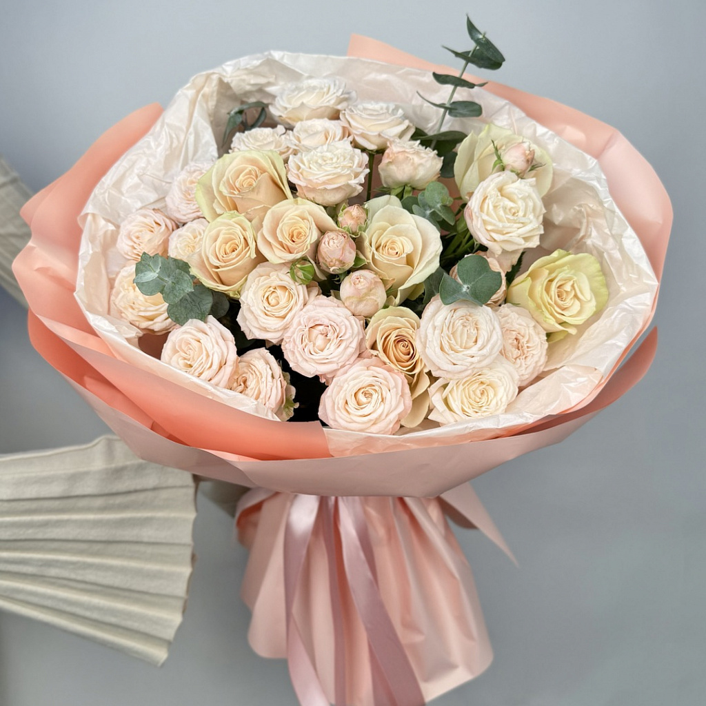 Современная упаковка - 1 шт., Лента атласная - 1 шт., Роза Талеа (50см) РОССИЯ - 7 шт., Роза кустовая пионовидная - 5 шт., Эвкалипт большой - 1 шт.