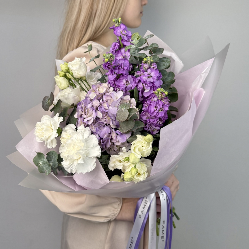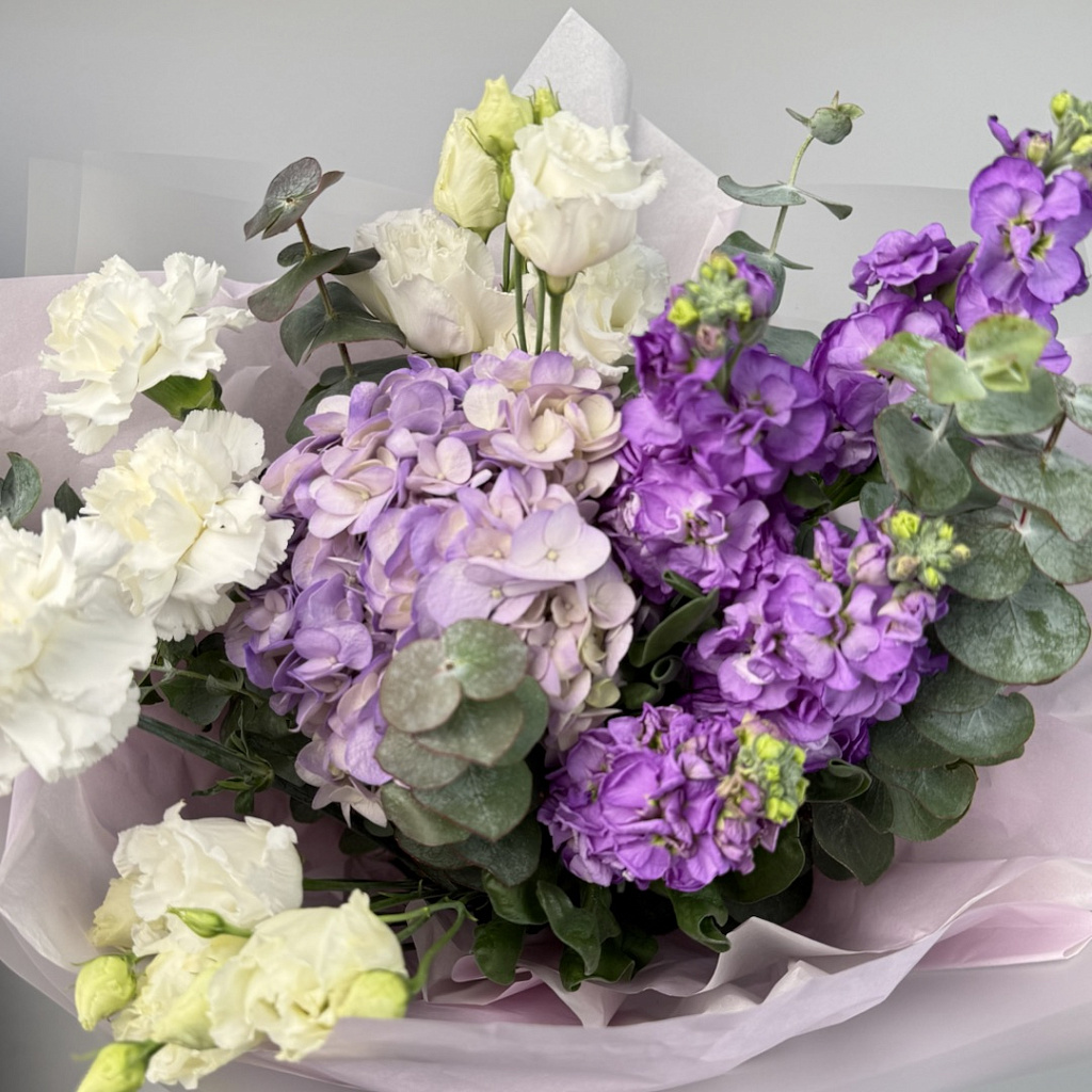 Гортензия - 1 шт., Гвоздика одноголовая цветная - 3 шт., Эустома - 2 шт., Маттиола - 2 шт., Эвкалипт большой - 2 шт., Современная упаковка - 1 шт., Лента атласная - 1 шт.